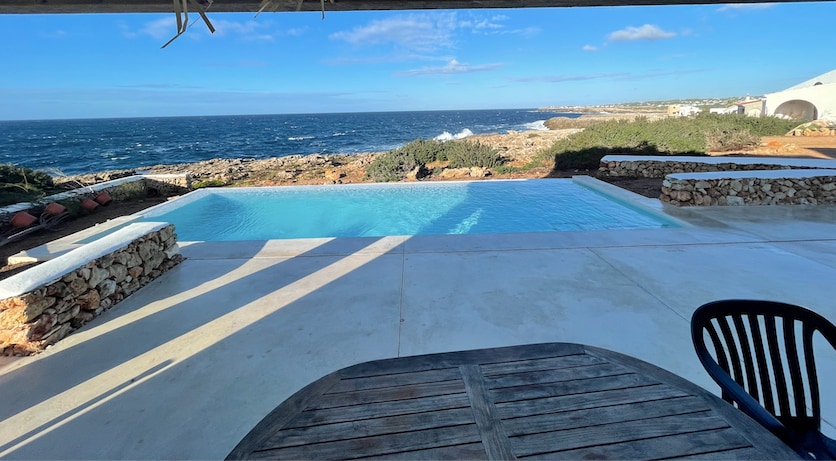 HOUSE with Infinity Pool over the sea. Incredible sea views at all times. Real 1st line right by the sea. Fully renovated (2025). A wonderful place for 6 to spend your holiday. 3 double rooms, 2 bathrooms. AC in every room. Free WIFI and Ethernet connection in every room. 5 min walk to the beach, Cala Binibèquer. BBQ in the terrace. Pool is 100% for private and exclusive use of house guests.