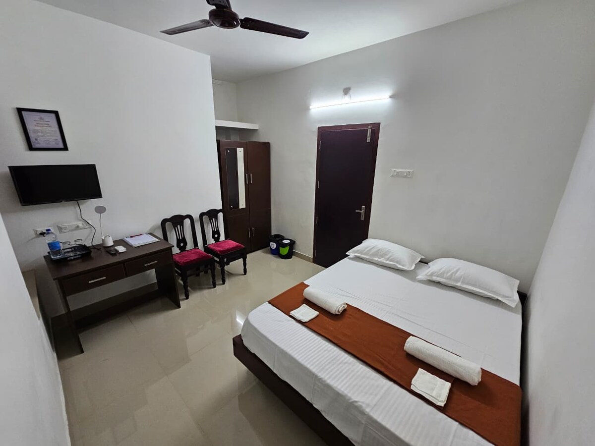 Sneha Apartment is a bright, comfortable 1BHK just minutes from the Guruvayur Temple. The flat has AC, fast Wi-Fi, a neat bedroom, a cosy living area, a functional kitchen, and secure parking inside the compound. It’s calm, clean, and easy to settle into, ideal for temple visits, short family stays, or work trips. A simple, convenient place to enjoy your time in Guruvayur. Ideal for 3 adults 1 child or 2 adults 2 children. 4 adults can also stay with 2 extra mattresses provided.