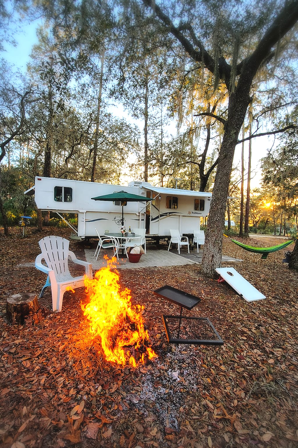 Your cozy Glamping on wheels a peaceful camper surrounded by nature, perfect for relaxing for those seeking peace, connection, fresh air. Here, days are meant to be slow: serene mornings, soft sunsets, and quiet nights. A simple, warm space designed to help you reconnect with yourself, enjoy nature and share the experience with your furry friend. Surrounded by trees with few neighbors, near Palatka, Gainesville, Ocala, some Springs, Restaurants, Liquor & Dollar Store, Pharmacy, Gas Station
