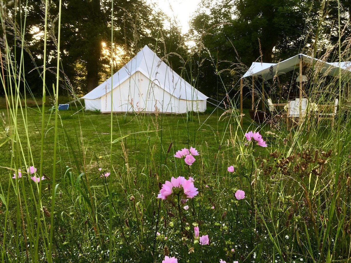 Lều Chuông dài 6 mét phong cách ("tente insolite", "tente cloche") trên khu cắm trại nhỏ, yên tĩnh Cool Under Canvas ở Puy-de-Dome. Giường cỡ King và ghế sofa giường ban ngày (làm cho 2 người độc thân). Nấu trên bếp EcoZoom than dưới bóng râm làm mát. Phòng câu lạc bộ chung có sân hiên có mái che. Phòng tắm vòi sen/nhà vệ sinh/tiện nghi giặt là chung. Chúng tôi được bao quanh bởi những ngọn đồi xanh tươi - những chuyến đi bộ mùa hè râm mát từ địa điểm này, đất nước đạp xe tuyệt vời, các hoạt động dành cho trẻ em: Lac Fades với những chiếc phao khổng lồ, công viên giải trí Vulcania, Parc Animalier d'Auvergne.