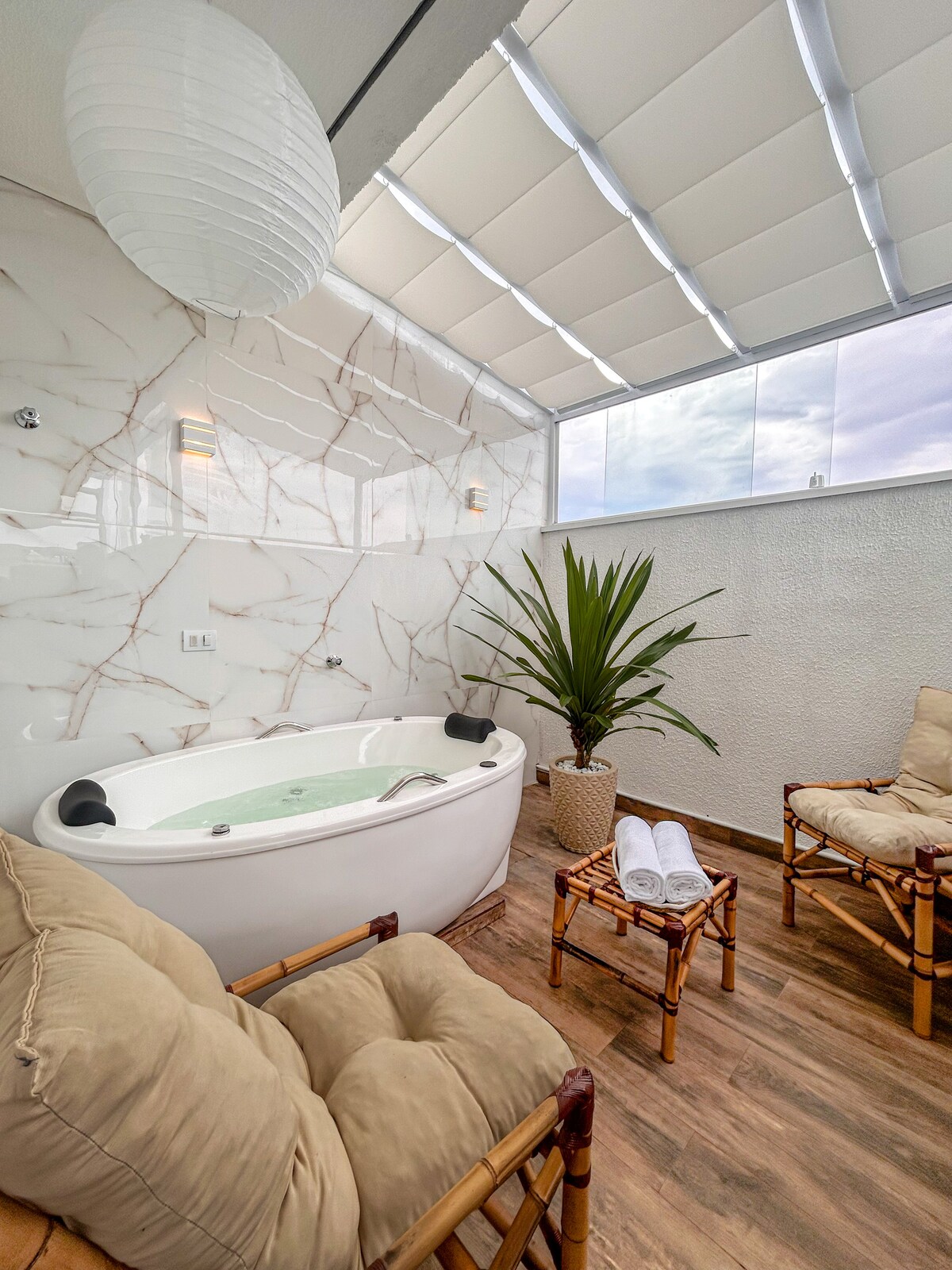 Căn penthouse tuyệt đẹp với tầm nhìn đẹp nhất ra thành phố São Paulo. Được trang bị sân hiên riêng với phòng xông hơi bằng kính với tầm nhìn toàn cảnh, bể sục siêu nóng với dịch vụ mát-xa thủy lực và ánh sáng trị liệu bằng kính, và một khu vườn với cây cối tuyệt đẹp cho một khoảng thời gian thư giãn khó quên. Không có gì giống như nó có sẵn để sử dụng ở São Paulo. Nhà bếp và phòng khách đều là kính, với trần gỗ và được trang bị máy chiếu công suất cao cho buổi chiếu phim riêng của bạn với bỏng ngô.