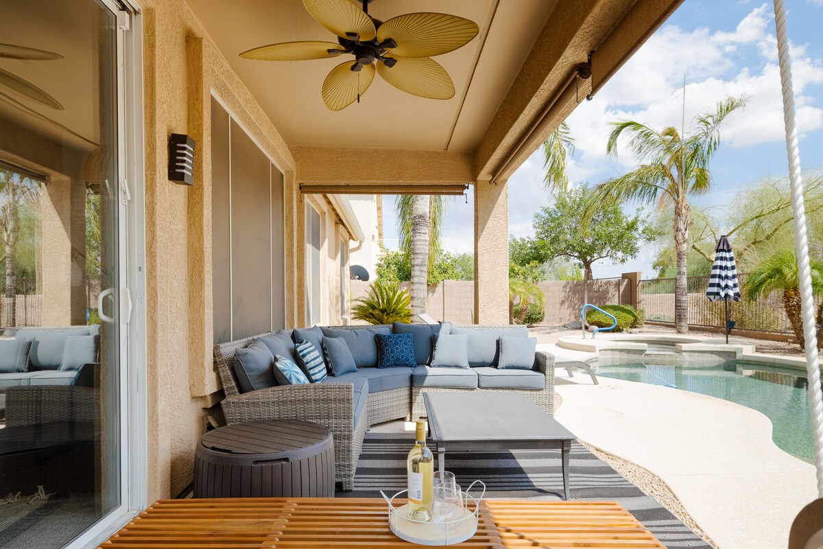 Chào mừng bạn đến với kỳ nghỉ trên sa mạc! Tận hưởng bố cục thoáng đãng, thoáng khí với phòng khách rộng rãi, bếp đầy đủ tiện nghi, không gian ăn uống phong cách và phòng ngủ mang lại cảm giác như ở nhà. Bước ra ngoài sân sau riêng tư được thiết kế riêng để thư giãn và vui chơi phù hợp với gia đình. Tận hưởng một lần ngâm mình trong hồ bơi và spa được sưởi ấm, thư giãn trên xích đu sân hiên hoặc đốt lửa nướng để có một bữa tối ngon miệng. Nằm cách Sân vận động Arizona Athletic Grounds chỉ 15 phút. Đừng quên chơi một vòng tại Câu lạc bộ Golf Las Colinas!