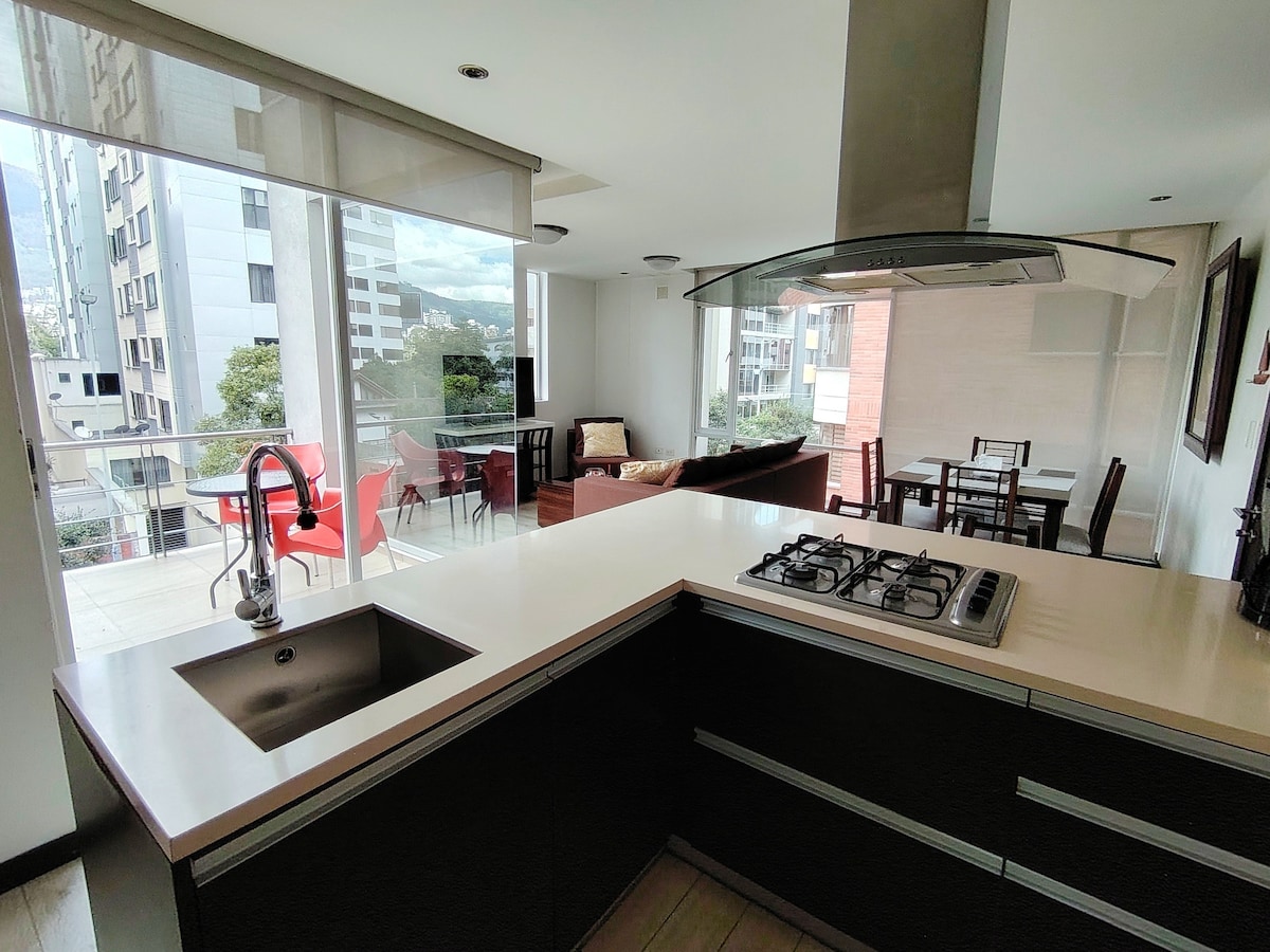 Căn hộ 2 phòng ngủ hiện đại ở vị trí đắc địa của Quito, khu vực khách sạn Marriott, cách Lãnh sự quán Tây Ban Nha, McDonald's, Crepes & Waffles, FOGO DE CHÂO, Burguer King, Mall el Jardin, các bộ, trường đại học và ga tàu điện ngầm vài bước chân. Lý tưởng cho du khách, cặp đôi, gia đình với tất cả các tiện nghi, ngay trung tâm thành phố. Tòa nhà an toàn, với nhân viên bảo vệ riêng 24/24 Cách Sân vận động Olympic Atahualpa 8 phút Cách Đấu trường La Mã Rumiñahui 8 phút 10 phút đến P Toros