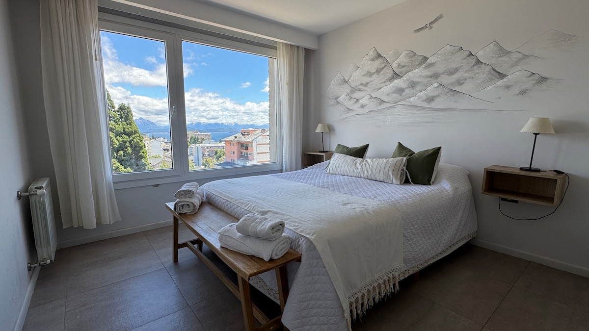 ! Departamento con inmejorable ubicacion a pasos de Cento Civico.Amplio y luminoso, preciosas vistas al Lago Manuel Huapi.Muy fácil acceso. Habitación con cama matrimonial y balcon con preciosas vistas, baño completo con bañera , cocina completa, living comedor Si eres un nómada digital, teletrabajas y necesitas buena velocidad de internet , el depto cuenta con fibra óptica y una velocidad de 330 megas
