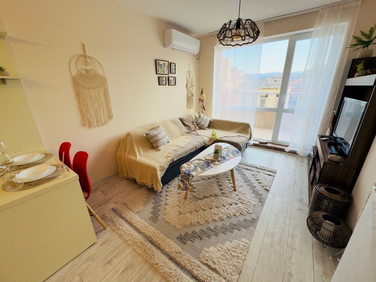 Welcome to my apartment.Newly renovated, with all amenities in the top center of Plovdiv. Literally located on the Main Pedestrian Street, 2-3 minutes walk from the Old Town and the Trap (Kapana), as well as many shops and restaurants.You will enjoy amazing sunrises and views of the city, the hills and the Old Town while drinking your morning coffee or just relaxing on the 8th floor balcony.The apartment is quiet, fully furnished and equipped, IPTV, fast WiFi.Suitable for business and relaxation