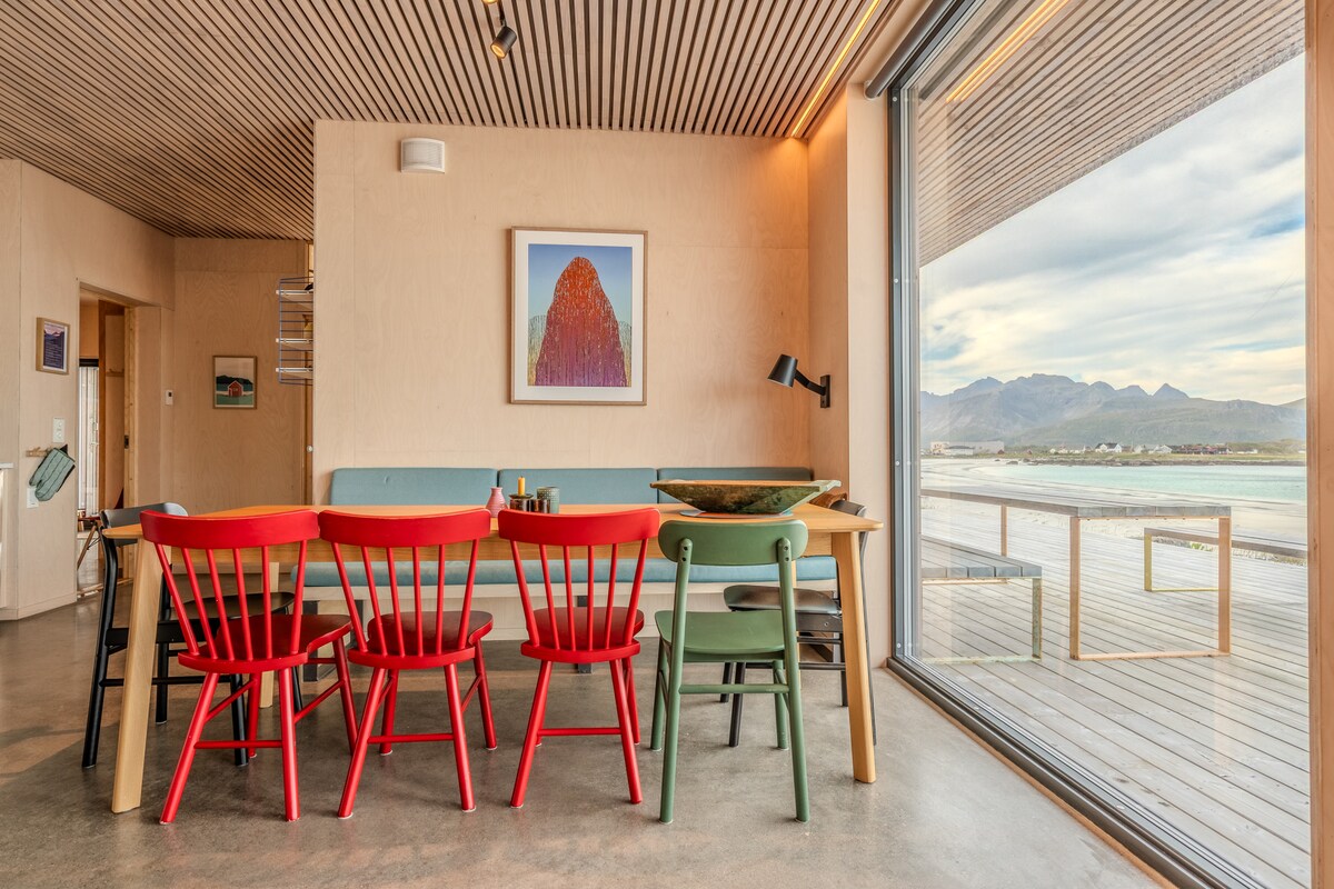Eksklusivt sjøhus i Lofoten –Sjøutsikt, nordlys og midnattsol. Velkommen til vårt moderne hus ved sjøen på Ramberg, Lofoten. Her får du spektakulær utsikt, nordlys om vinteren og midnattsol om sommeren. Huset har høy standard, gode senger, romslig kjøkken og stor uteplass. Etter turen eller surfingen kan du nyte badstu med vill havutsikt. Perfekt beliggenhet for naturopplevelser, fjellturer og strender. Opplev Lofoten fra første rad!