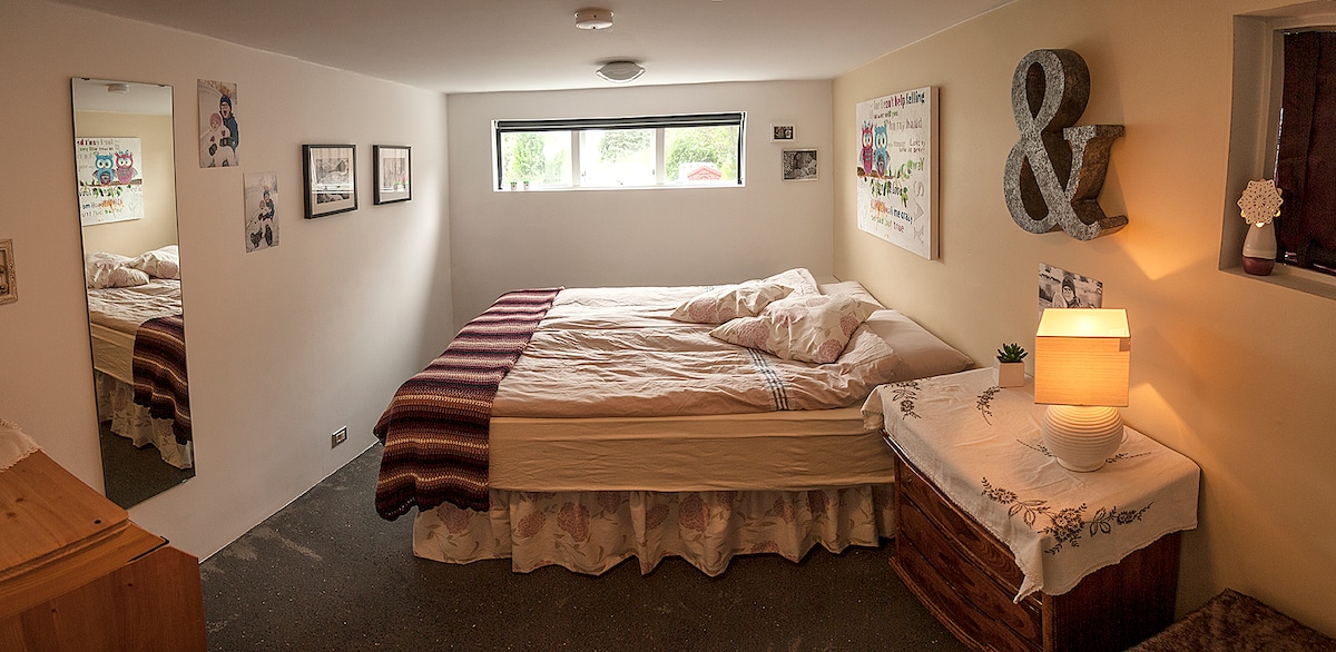 Tầng trên cùng, nằm ở trung tâm và kết nối tốt với các điểm dừng xe buýt và đường chính. Nhà bếp đã được cải tạo hoàn toàn vào năm 2022. Có cửa sổ và tầm nhìn ở mọi hướng. Trong Phòng Lớn, được cải tạo vào năm 2025, có một chiếc giường 200x180cm và ghế sofa dài, cho người thứ ba. Các cửa sổ hướng về phía Nam và phía Tây, có "rèm chắn sáng" để tránh ánh nắng mặt trời nửa đêm. Có sách về Iceland và loa bluetooth. Một tủ quần áo và một cái bàn. Bạn có thể mượn một chiếc TV nhỏ. Giấy phép cho thuê Iceland: HG-4537