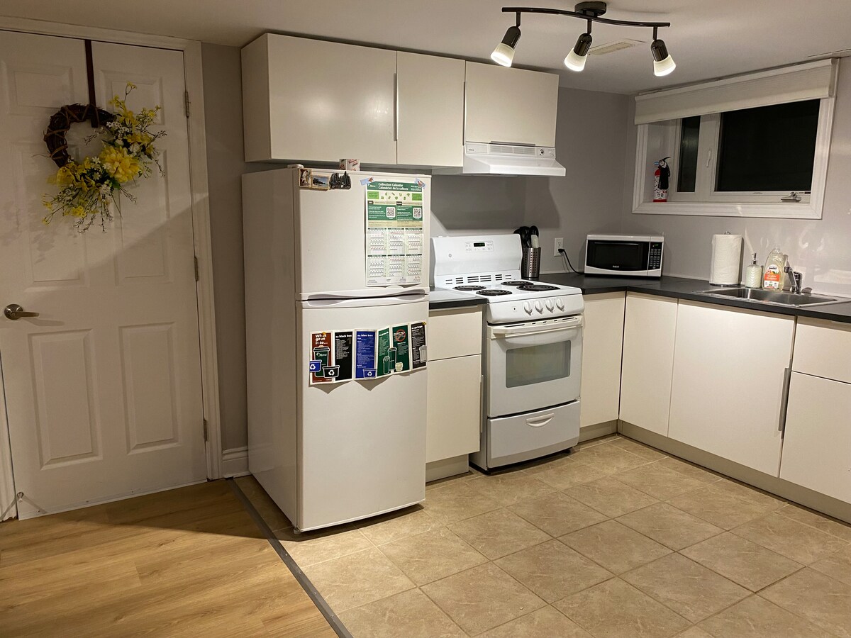 Trải nghiệm sự thoải mái và phong cách trong nhà bếp và phòng khách theo ý tưởng mở mới hoàn thiện, hiện đại của chúng tôi. Được trang bị TV, tủ lạnh/tủ đông, lò vi sóng/lò nướng, nồi chiên không khí, máy giặt và máy sấy. Chỉ 8 phút từ sân bay, 20 phút đến trung tâm thành phố và khoảng cách đi bộ đến các cửa hàng tạp hóa, quán cà phê, công viên và nhà hàng. Tận hưởng sự riêng tư với lối vào riêng và phòng ngủ an toàn với chìa khóa có khóa riêng. Khu phố yên tĩnh, hoàn hảo cho công việc hoặc vui chơi. Đặt ngay để có thời gian lưu trú đáng nhớ tại Ottawa!