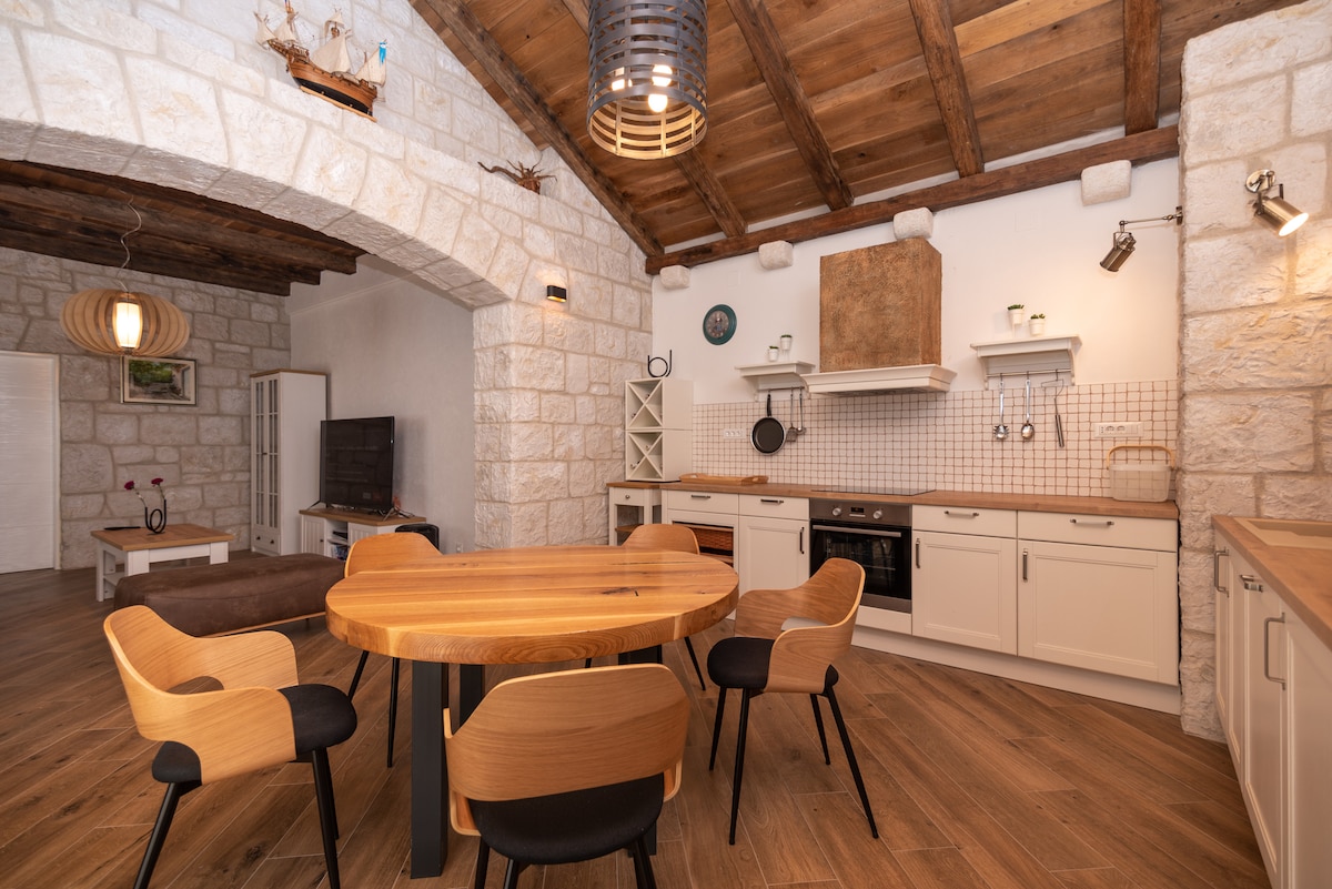 Một chỗ ở tinh tế tuyệt vời Adriatic Pearl. Quang cảnh ngoạn mục trực tiếp trên biển - một nơi nghỉ ngơi lãng mạn hoàn hảo. Ngôi nhà đá thế kỷ 17 mới được cải tạo. Một lâu đài nhỏ với các thiết bị hiện đại, giường nổi, đèn chùm, tủ lạnh rượu vang, Wifi tốc độ cao và TV với quyền truy cập vào tất cả các kênh quốc tế. Vị trí đắc địa này cách các bãi biển, nhà hàng tuyệt vời và Lâu đài Zinfandel mới được cải tạo một quãng ngắn. Chỉ cách sân bay Split 10 phút lái xe. Trải nghiệm 50 SẮC THÁI của MÀU XANH DƯƠNG