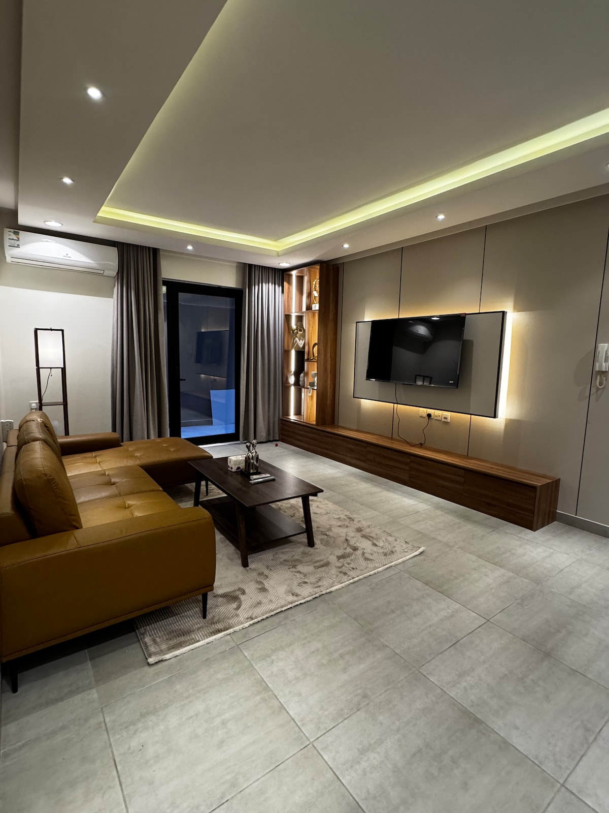 A modern apartment designed for an exceptional stay, located in one of Riyadh’s finest neighborhoods with a stunning view of KAFD. It features an outdoor seating area with a screen and projector for enjoyable evenings. For your comfort, the bed includes a high-quality 14cm extra layer. “We also offer event coordination services for special occasions (including cake and accessories) for an additional fee with prior booking, ensuring an unforgettable experience “