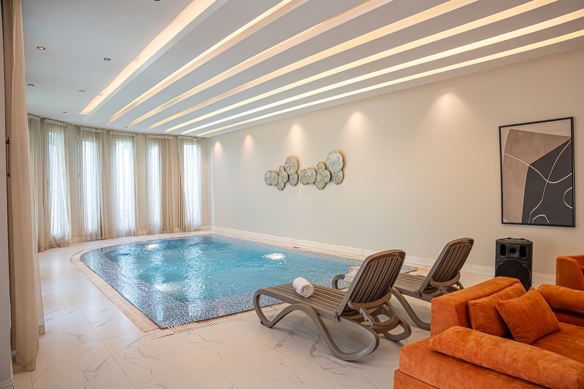A luxurious 450 sqm villa combining elegance and serenity, ideally located on Al Thumama Road, just 15 minutes from King Khalid International Airport. Features a master bedroom with a king bed, a fully equipped kitchen, a stylish dining area, a private pool, and an outdoor seating surrounded by greenery. The perfect retreat for those seeking comfort, privacy, and relaxation. 🌿