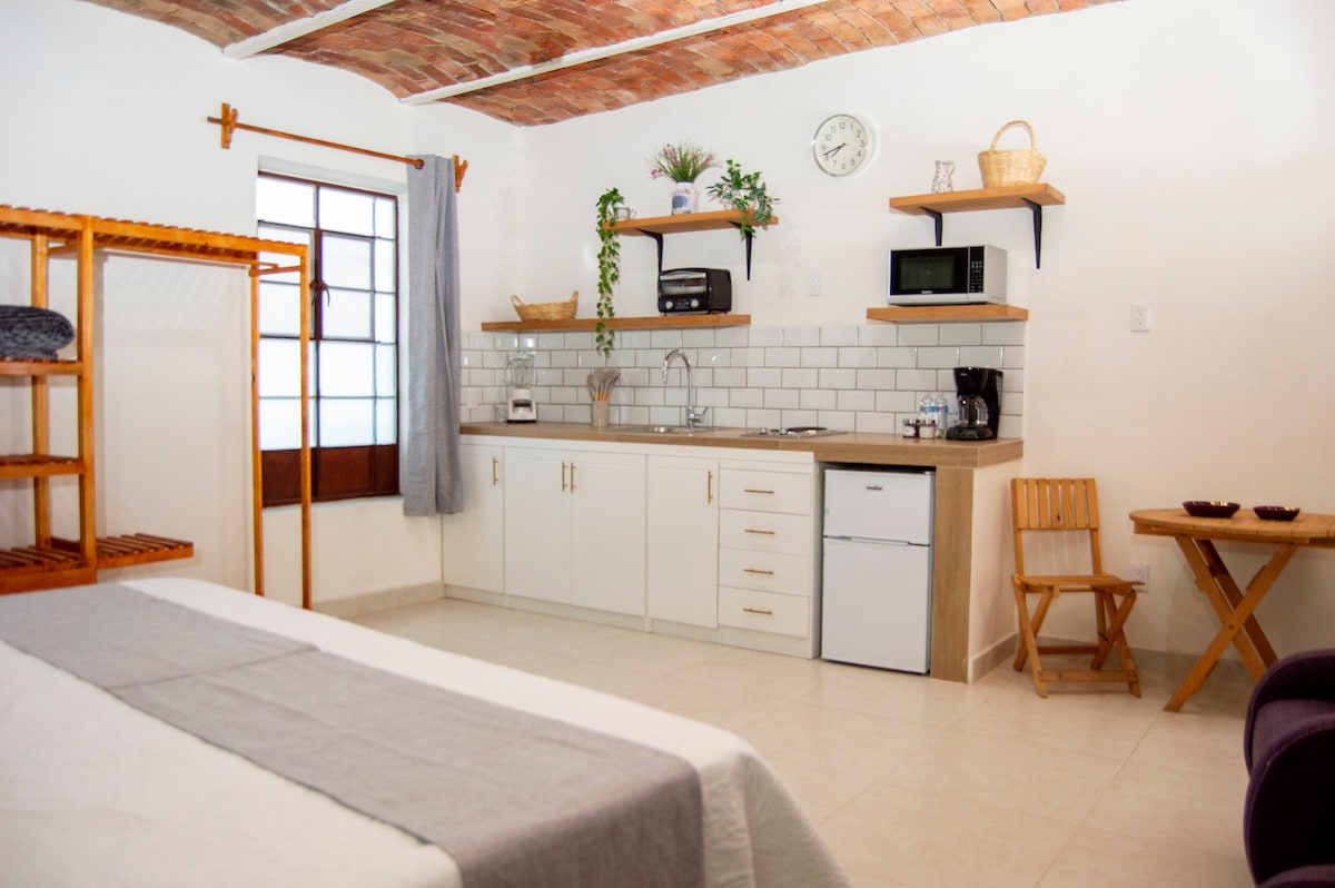 Disfruta de la sencillez de este alojamiento tranquilo y céntrico. Situado a unos pasos de la plaza central de el pueblo mágico de Ajijic, corazón de la actividad cultural, gastronomíca y recreativa. Este luminoso espacio cuenta con área de dormitorio, baño, una pequeña cocina con cafetera, estufa y refrigerador además de utencilios básicos de cocina. Cuenta con amplio jardín dentro de las áreas comunes para disfrutar de un buen café. Espacio idela para un par de personas.