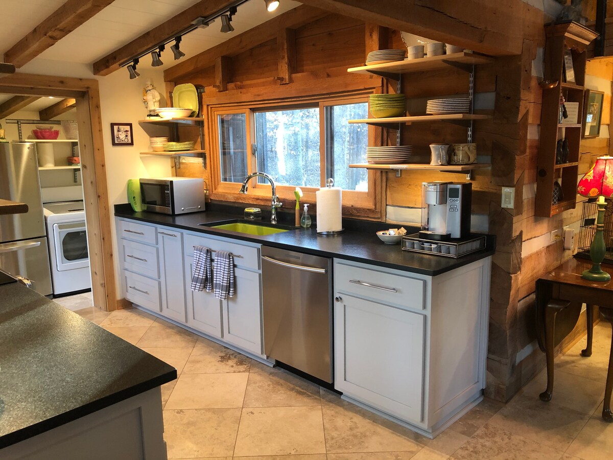 Upon your arrival to this secluded setting, you will find a charming modern log house. No detail has been overlooked in the decor and furnishings to make you feel at home. On the main floor is a generous living area which includes a contemporary kitchen with many amenities, a bathroom with a walk-in shower and a laundry room, if needed. Up the staircase is the loft with a king size bed, a twin XL daybed and a sleeper sofa. Pls note: this property is unsuitable for children 12 and under.