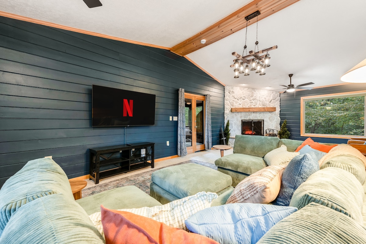 Trốn đến Blue Ridge Mountain Lodge, nơi gặp gỡ thư giãn và phiêu lưu. Ẩn mình giữa lòng núi, nơi nghỉ dưỡng 4 phòng ngủ |2BA này có tầm nhìn ngoạn mục từ boong tàu. Tập trung quanh lò sưởi để thưởng thức s'mores, ngâm mình trong bồn tắm nước nóng hoặc trẻ hóa trong phòng xông hơi khô. Một bức tranh tường 30'tuyệt đẹp cho những bức ảnh đáng nhớ, trong khi phòng trò chơi hứa hẹn hàng giờ vui vẻ cho tất cả mọi người. Trải nghiệm sự pha trộn hoàn hảo giữa thư giãn và phấn khích trong kỳ nghỉ khó quên này. 4x4 là yêu cầu bắt buộc trong điều kiện tuyết/băng giá.