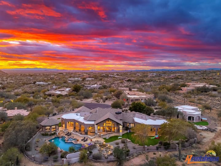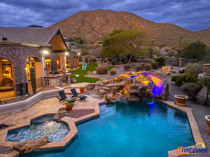 Ẩn mình trong khung cảnh sa mạc Scottsdale hùng vĩ và khung cảnh núi non hùng vĩ, kiệt tác đương đại này không chỉ là khung cảnh tuyệt đẹp. Nằm gần thuận tiện, chỉ cách nhà hàng sành ăn, địa điểm mua sắm cao cấp, sân golf ưu tú và lối đi bộ đường dài tiếp thêm sinh lực vài phút. Và đối với những người đam mê đi bộ đường dài, lối vào Đường mòn Pinnacle Peak nổi tiếng chỉ cách đó 7 phút đi bộ. Với sức chứa hơn 16 khách trên 5 phòng ngủ và 4,5 phòng tắm, bao gồm bồn tắm hồ bơi, The Scottsdale Diamond đảm bảo mọi người trong nhóm của bạn đều có thời gian lưu trú xa hoa. Bất động sản được tu sửa tuyệt đẹp với hoàn thiện tùy chỉnh hoàn thiện. Khách sẽ có thể mong đợi một mức độ dịch vụ cao cấp với các tiện nghi giống như khu nghỉ dưỡng tại chỗ ở của chúng tôi. Toàn bộ ngôi nhà được trang bị như một khách sạn với ga trải giường, khăn tắm, dầu gội đầu, dầu xả, v.v. Khu nghỉ dưỡng sân sau là một giấc mơ giải trí cạnh tranh với bất kỳ khu nghỉ dưỡng nào trong thành phố. Sân hiên có mái che có khu vực ăn uống rộng rãi và TV ngoài trời. Sân hiên mở rộng với phòng chờ và chỗ ngồi, sân thể thao, cầu trượt nước, lò sưởi chìm, hồ bơi lấp lánh và nhiều tiện nghi khác.