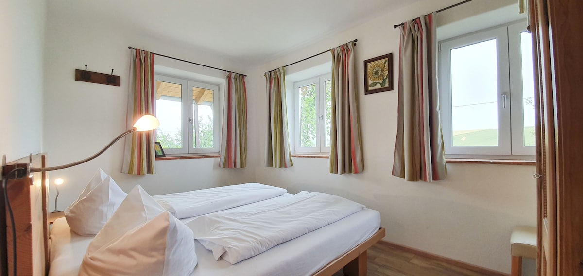 Our organic farm with horses, dairy cows and chickens is situated in an idyllic and quiet location despite very good transport links. You can enjoy an unobstructed view of Rosenheim's local mountains. Many cycle paths lead past us, several bathing lakes are in the immediate vicinity. Traditional construction, natural materials, modern comfort and a high level of quality combine to create a cozy atmosphere.