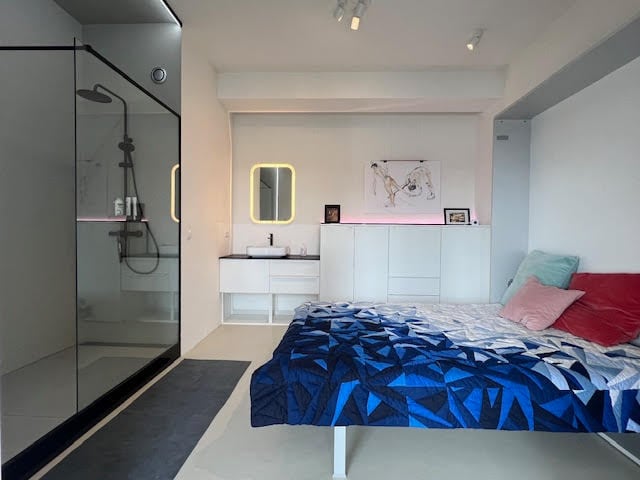 The studio is conveniently located on the ground floor. It's a private space equipped with all comforts. Comfortable bed, kitchen where you can prepare a simple meal, table and chairs, Nespresso coffee machine & water cooker. The comfortable bathroom has a showercabinet, sink and toilet. Bathtowels, shampoo, conditioner, hairdryer, iron are included.