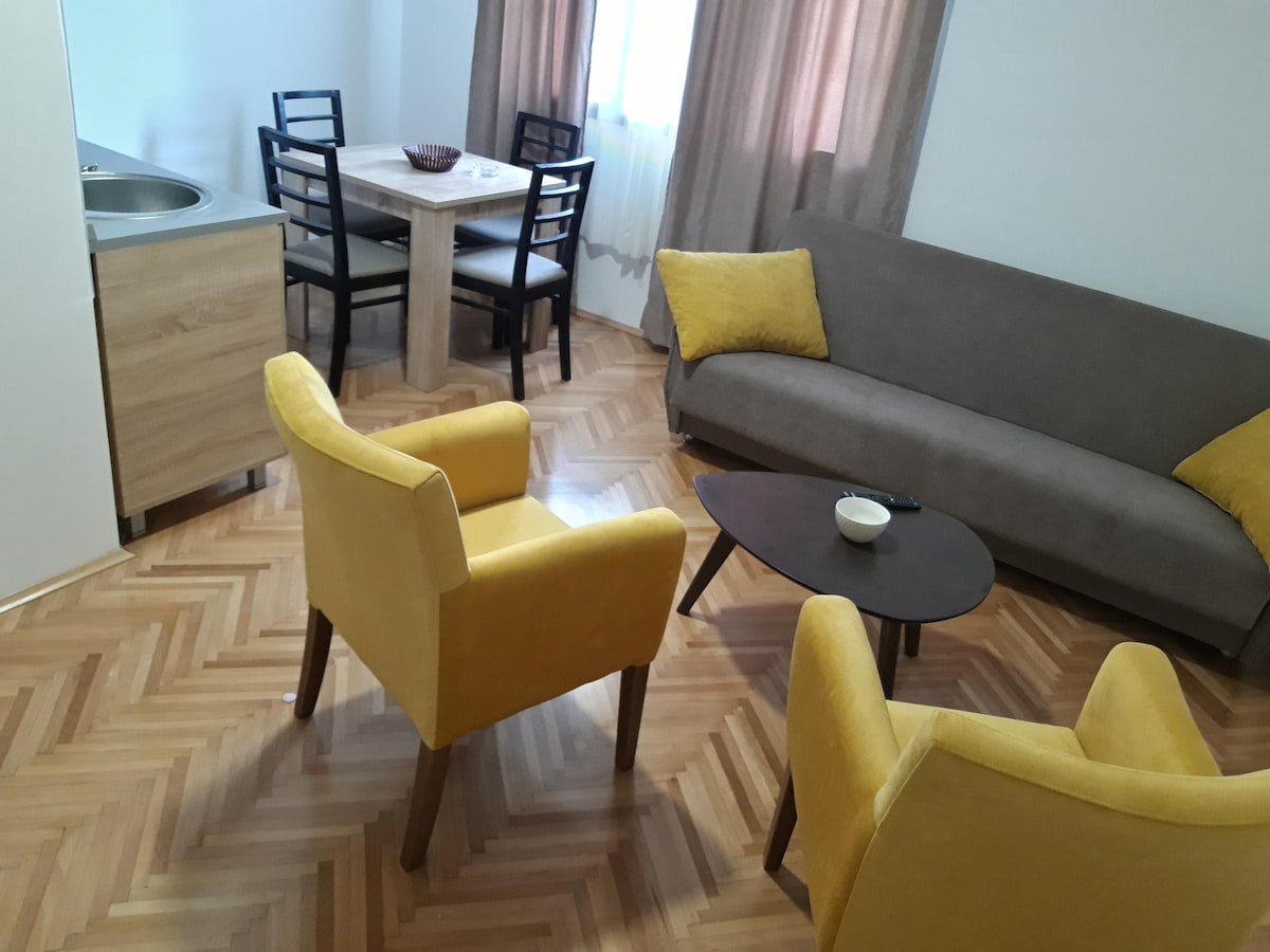Chào mừng bạn đến với căn hộ đầy phong cách, được trang bị đầy đủ tiện nghi của chúng tôi ở trung tâm Sokobanja, phù hợp cho cả thời gian lưu trú ngắn và dài. Không gian này ấm cúng và riêng tư, hoàn hảo cho các cặp đôi, gia đình nhỏ hoặc các chuyến đi với bạn bè. Nó có khu vực sinh hoạt ấm cúng với ghế sofa sang trọng dễ dàng biến thành giường sofa thoải mái, TV màn hình phẳng, khu vực ăn uống, điều hòa không khí, Wifi. Một phòng ngủ lớn thoải mái với giường cỡ queen và không gian tủ quần áo lớn. Nhà bếp, phòng tắm, ban công, bãi đỗ xe đầy đủ tiện nghi. Tự kiểm tra.