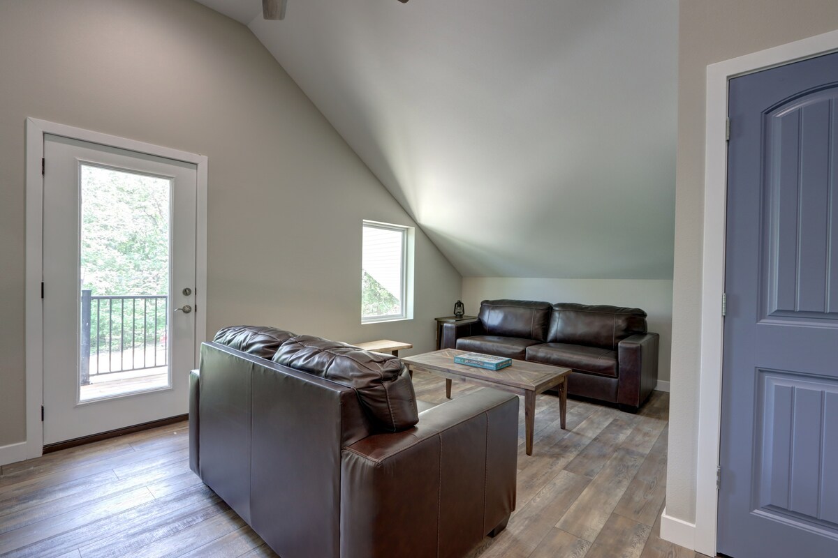 Ngôi nhà nghỉ thôn dã ấm cúng trong rừng này (hoàn thành vào tháng 6 năm 2017) hoàn hảo cho một cặp đôi đang tìm kiếm một kỳ nghỉ lãng mạn, tận hưởng tuần trăng mật hoặc kỷ niệm. (Ghế sofa là một chiếc giường có thể chuyển đổi đầy đủ, nếu những người khác có kế hoạch chia sẻ không gian rộng hơn400 feet vuông.) Nằm trong khu phố Lake Hill (trước đây là Shadow Lake) Golf Course (sân golf hiện đang đóng cửa) cách bờ Tây Bắc của Hồ Pomme de Terre xinh đẹp và khoảng 6 dặm về phía nam của Lucas Oil Speedway.