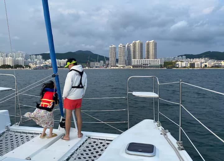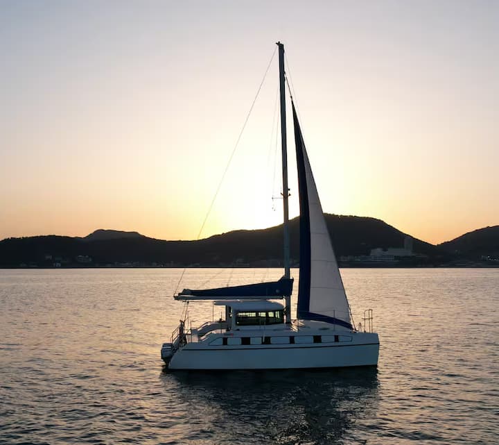 Tham quan biển cùng thuyền buồm và dấu phẩy nổi trên mặt biển
