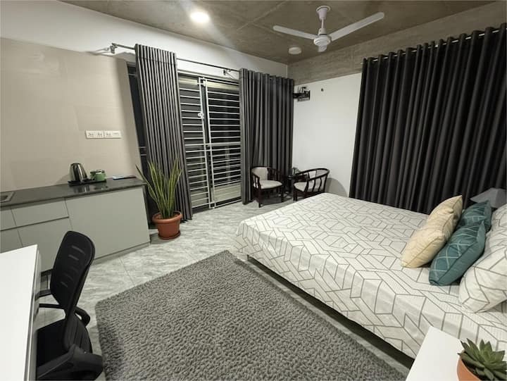 Phòng ngủ có điều hòa không khí với nhà vệ sinh chung