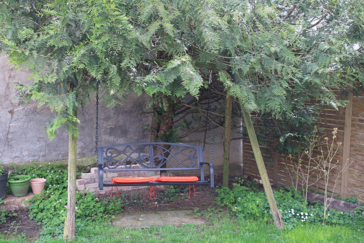 Die Ferienwohnung ist einfach, gemütlich, naturnah für 2 Erwachsene+Kleinkind+Hund Küche mit Esstisch für 4 Personen, Lesesessel, Backofen, Toaster, Kaffeemaschine, Wasserkocher, Koch-Ess-Grundausstattung, bioTee, bioFilterkaffee, bioÖl, bioEssig WohnSchlafraum Bad mit Dusche Balkon mit Gartenblick+Sitzgelegenheit Spirit of Om Bettwäsche+Handtücher Auf der gleichen Etage ist unser Sonnenzimmer. Wenn Ihr zu viert reist: Einfach dazu buchen. https://www.airbnb.com/slink/Loatly6i