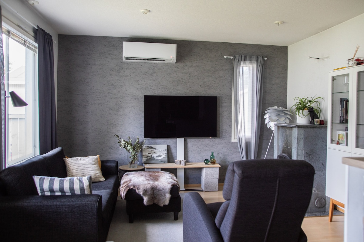 A modern scandinavian style apartment (39 sq.) close to Rovaniemi city center with nice river and city view. Our apartment has private entrance and can comfortably fit up to four persons. Ounasvaara hiking just around the corner, city center with many restaurants and attractions reachable by walking. Kitchen/sauna/shower/toilet/aircon/washing machine/air dryer/bed linen and towels included/TV/Chromecast/Free Wi-Fi/furnished private terrace/car heating socket.