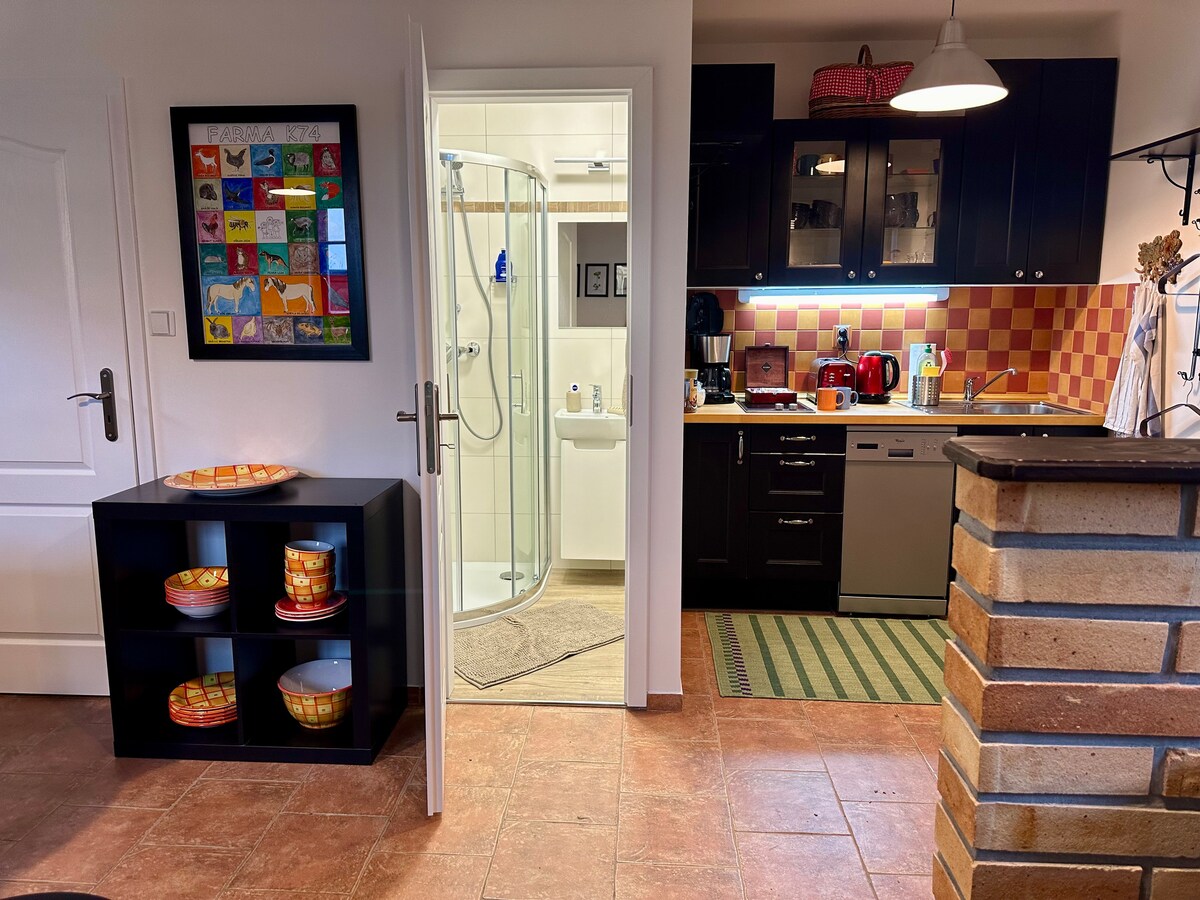 Chỗ ở tại Nông trại dưới Lovoš ngay trung tâm Khu vực cảnh quan được bảo vệ của Cao nguyên Bohemian. Căn hộ phong cách nằm ngay giữa các chuồng ngựa, nơi cuộc sống được chi phối bởi nhịp điệu của thiên nhiên. Gia súc đi lại tự do, và vào buổi sáng bạn có thể bị đánh thức bởi tiếng ngựa hí hoặc tiếng gà trống gáy. Một nơi lý tưởng cho những người yêu thích sự yên bình, động vật và vùng nông thôn đích thực.
