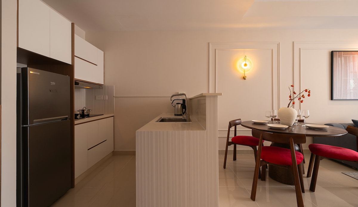 Trải nghiệm không gian sống hạng sang tại Duplex Penthouse mới xây, phong cách Wabi-Sabi độc bản. Tận hưởng tầm nhìn ôm trọn sông Sài Gòn, cầu Ba Son và Quận 1 từ cửa kính full-height, đặc biệt đẹp về đêm. • Vị trí kim cương: 5-10 phút đi bộ đến Công viên bờ sông & Metro Ba Son. • Nội thất xa xỉ: đàn Piano, Smart TV 86", đèn chùm lớn, bồn tắm thư giãn. • Không gian: 3 phòng ngủ, tràn ngập ánh sáng, lý tưởng cho 4-6 người.