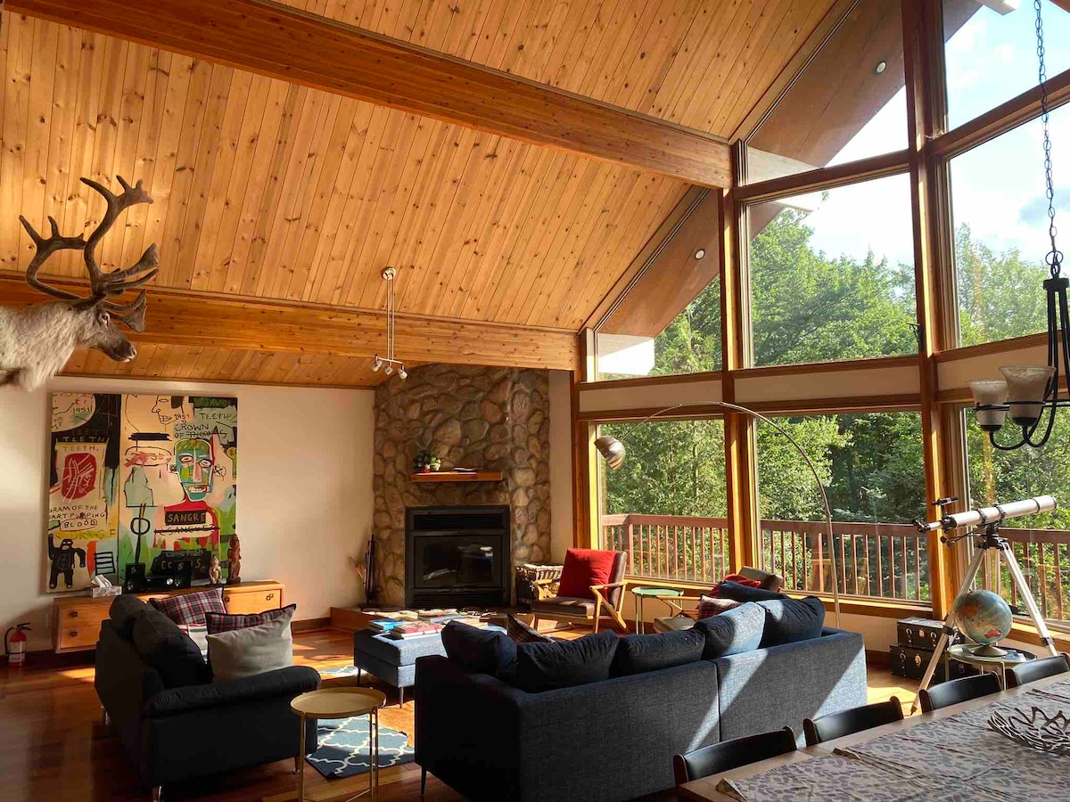 Monumental open concept, in the heart of nature. Access to trails directly behind the house. Wood stove, large modern bathroom, one bedroom + sofa bed. Another sofa bed in the living room. Ideal chalet for a couple with children or two couples. Wild birds, turkey, and deer lovers welcome! Wifi and EV charger included. Dogs Welcome! CITQ : #308038
