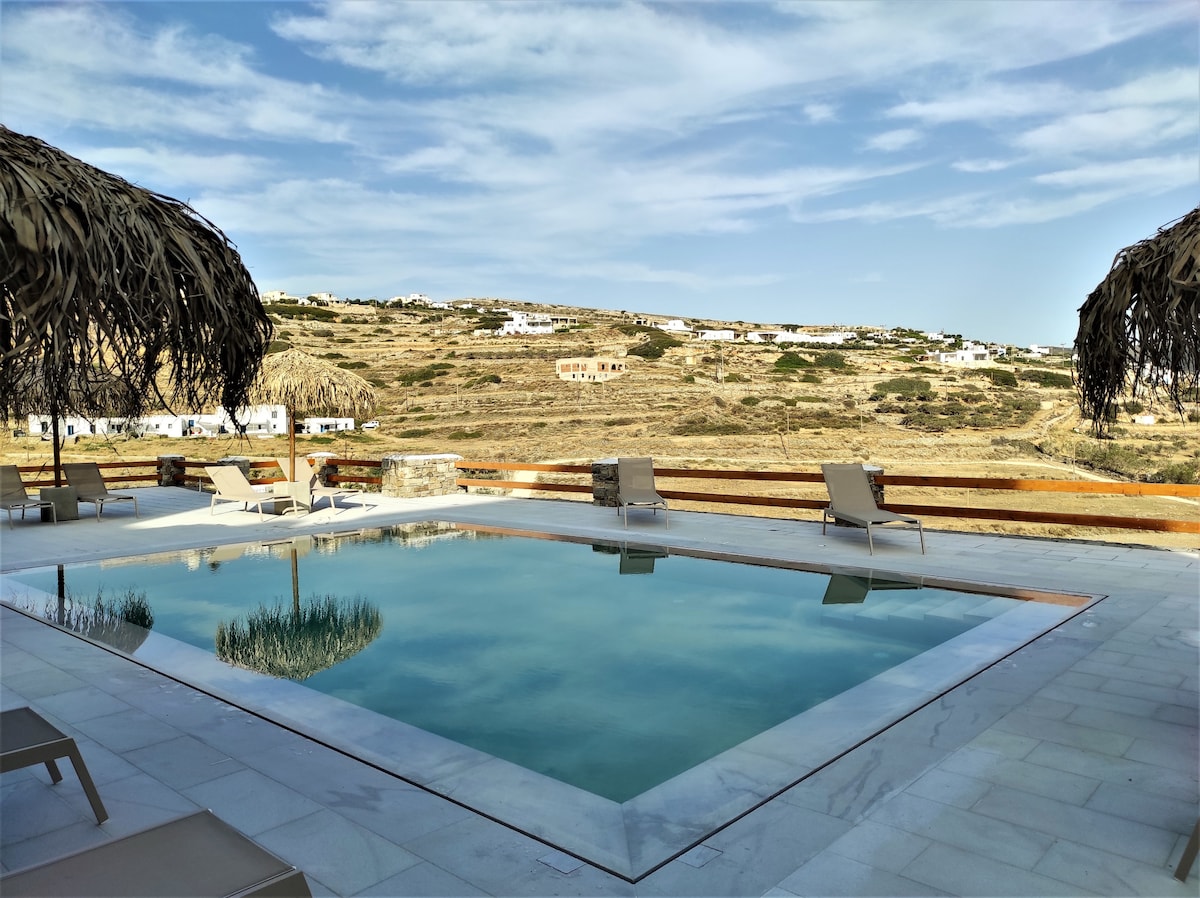 Mở cửa chớp màu xanh biển và đón gió mát, sau đó chuẩn bị một bữa ăn nhẹ tại mặt bàn bếp bê tông đô thị tại một khu nghỉ dưỡng ven sông lộng gió. Bước lên hiên rộng rãi, nhiều lá để thưởng thức đồ uống hoàng hôn nhàn nhã với tầm nhìn ra đại dương không bị cản trở! Căn hộ nằm cạnh bãi biển đầy cát để bơi buổi sáng và cách trung tâm Naousa và quảng trường chính của nó 2 phút đi bộ. Các cửa hàng, nhà hàng, quán bar và câu lạc bộ nằm trong khoảng cách đi bộ, nhưng khu vực này rất yên tĩnh và tĩnh lặng!