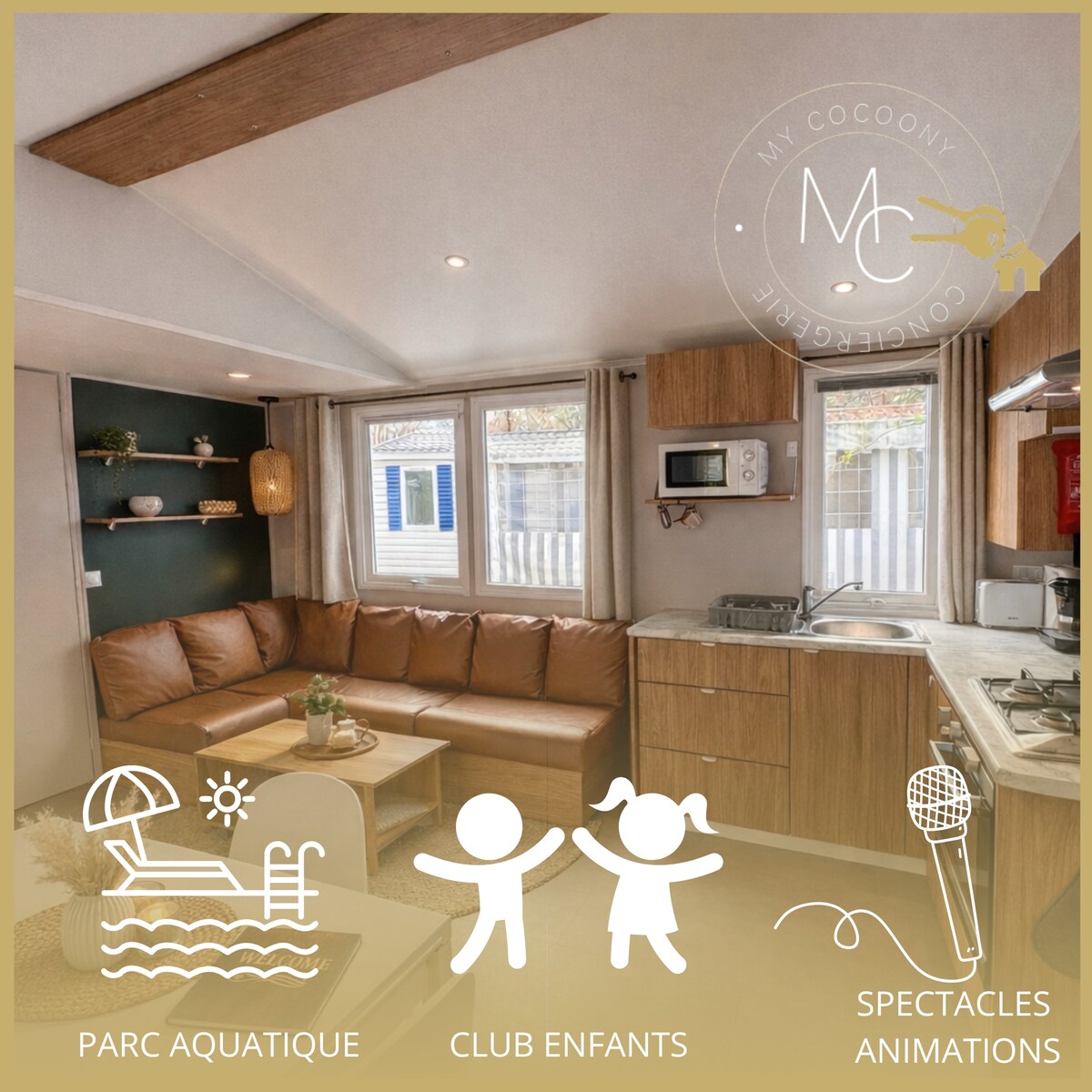 MH 8 người, 3 phòng ngủ, khu cắm trại 4 *. Vị trí tuyệt vời. Trong khu cắm trại "Le Bois Masson", theo thỏa thuận với khu cắm trại "Le Bois Dormant", nơi bạn cũng sẽ có quyền sử dụng, 6 hồ bơi nước nóng có cầu trượt. Ăn uống, sân chơi trong khuôn viên. Sân quần vợt, phòng tập thể dục, jaccuzi, phòng tắm hammam, phòng xông hơi khô. Ăn uống tại chỗ, cũng như một cửa hàng tiện lợi. Nhà di động năm 2015 rộng 40 m2, bao gồm 3 phòng ngủ, giường sofa cho tối đa 8 khách.