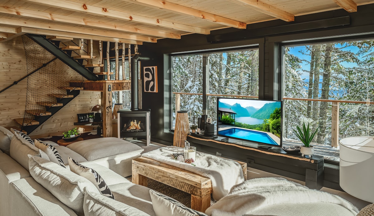 Small Scandinavian chalet for two people ideally located to enjoy the attractions of Charlevoix. It has a thermal circuit (hot tub, sauna, hammam) Very intimate and in the middle of the woods, the view overlooks the majestic river and the mountains in the distance. All the modern equipment is there and the comfort is absolute A/C and outdoor fireplace. The open concept design was designed for an immersive experience in nature: large windows, panoramic shower. Access via a private road at 500 m.
