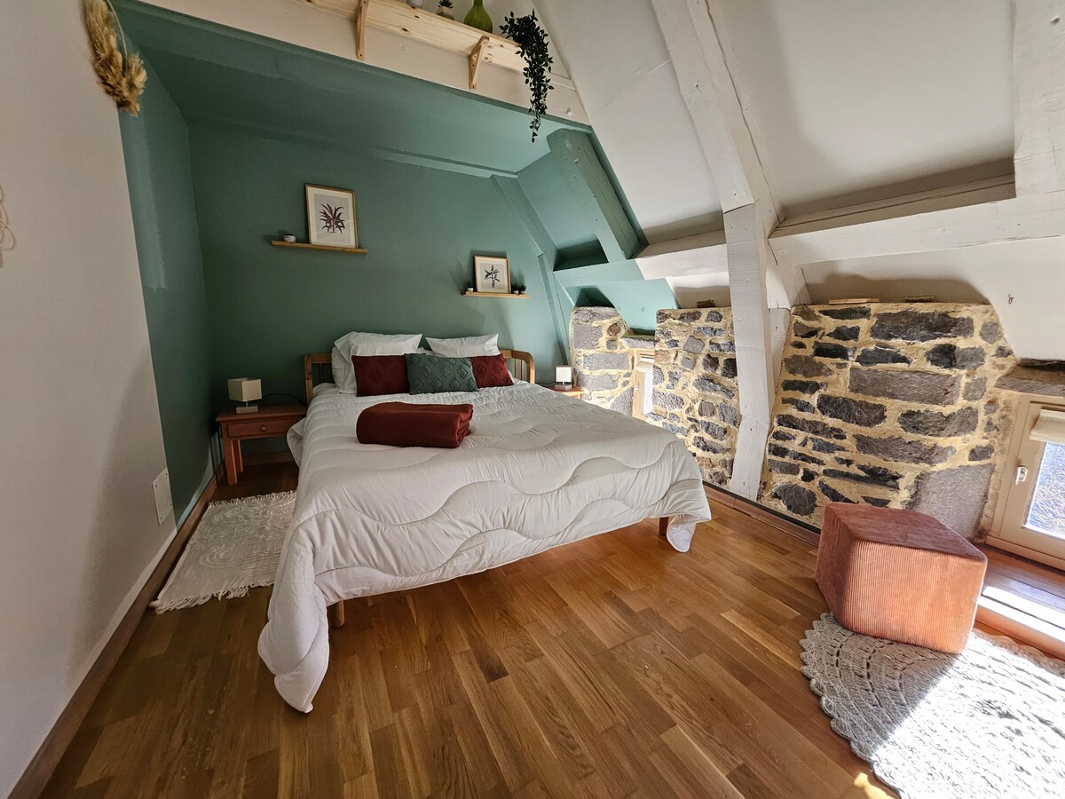 Grand appartement duplex SANS AUCUN ESPACES À PARTAGER (ce qui n'était pas le cas avant). Chambre climatisée à l'étage, avec douche hammam (bain de vapeur), lit Emperor (2x2m) dans ancien hôtel rénové, salon TV privé, au centre du village en désertification de Rochefort-Montagne. chambre : Matelas 2x2m sur cadre à lattes, machine à café Senseo, bouilloire et petit réfrigérateur. Draps/couettes/serviettes fournies, Wifi à chaque étage, Grande Cuisine au rez-de-chaussée, salon, TV Android.