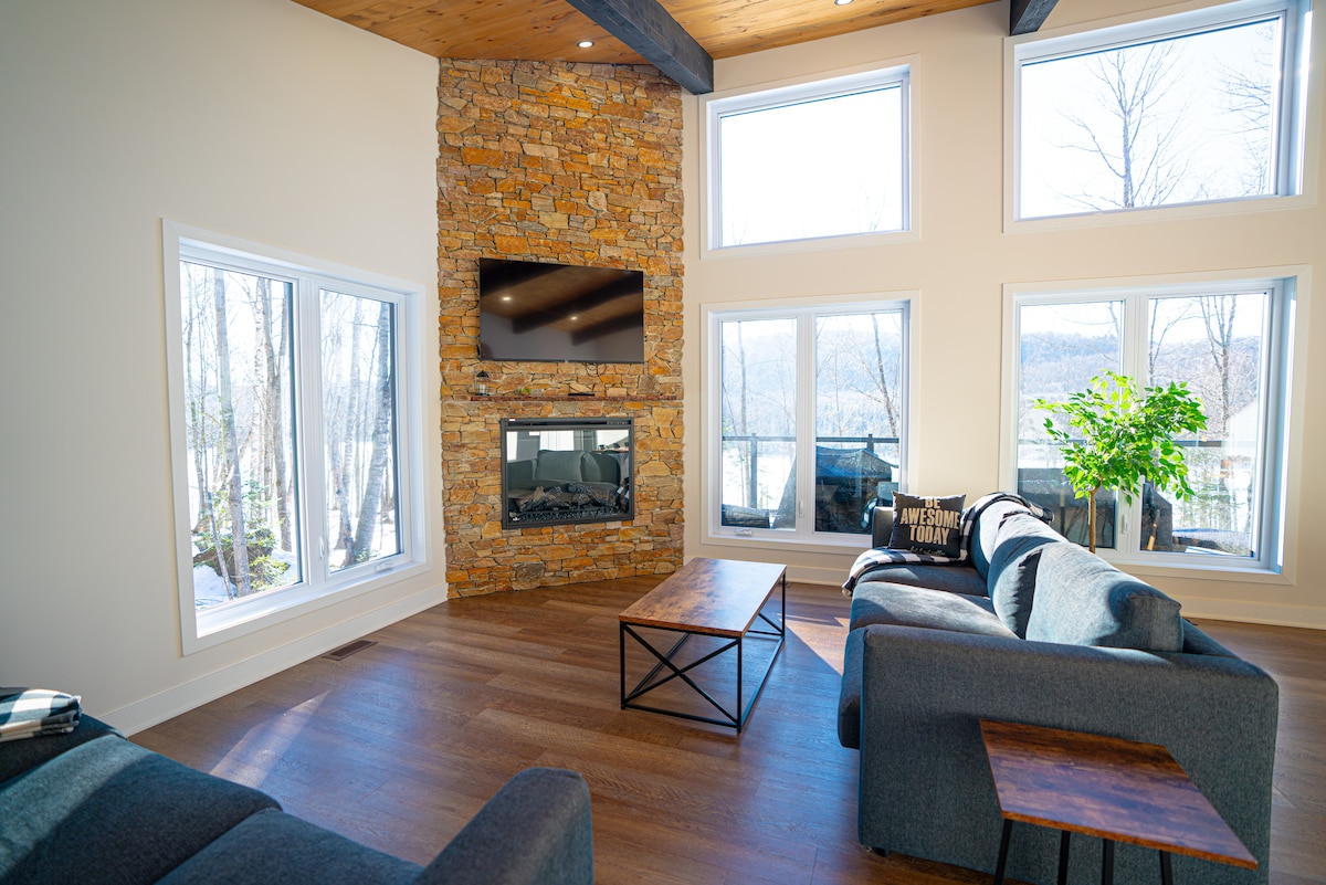 Chào mừng bạn đến với Meraki Chalet, một nơi nghỉ dưỡng ven sông ở Val-Morin, cách Montreal một giờ. Nằm trên diện tích 1,5 mẫu Anh riêng tư dọc theo dòng Sông Bắc yên tĩnh, ngôi nhà gỗ ba tầng này được xây dựng cho các nhóm lớn muốn thực sự thư giãn. Hãy đến vào mùa xuân và mùa hè: chèo thuyền kayak từ bến tàu riêng, chèo thuyền trên sông, đi bộ trên những con đường mòn trong rừng và kết thúc mỗi buổi tối trong bồn tắm nước nóng 9 chỗ có mái che. Ngủ tối đa 14 người.