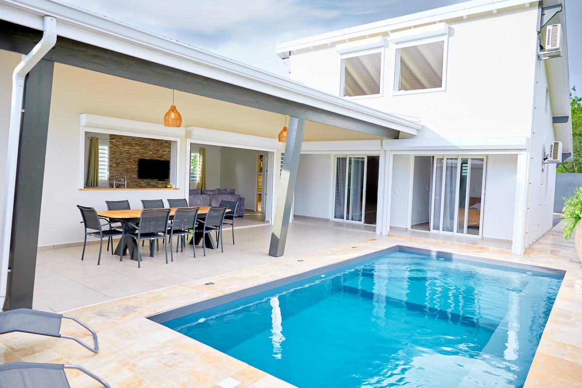 Chỗ ở phong cách này hoàn hảo cho các nhóm. Khám phá ngôi nhà quyến rũ này để có một kỳ nghỉ thú vị ở St Anne gần Plage Bois jolan cửa hàng 15 phút đi bộ 3 phòng ngủ có điều hòa không khí đẹp bao gồm 1 phòng chính có phòng tắm 1 phòng tắm chung nhà bếp lớn được trang bị đầy đủ tiện nghi, phòng khách có TV một sân thượng đẹp cho bữa ăn của bạn với khu vực chỗ ngồi ngoài trời cho rượu khai vị, một hồ bơi xử lý muối, một bể đệm vườn nhiệt đới để bù đắp cho việc mất nước