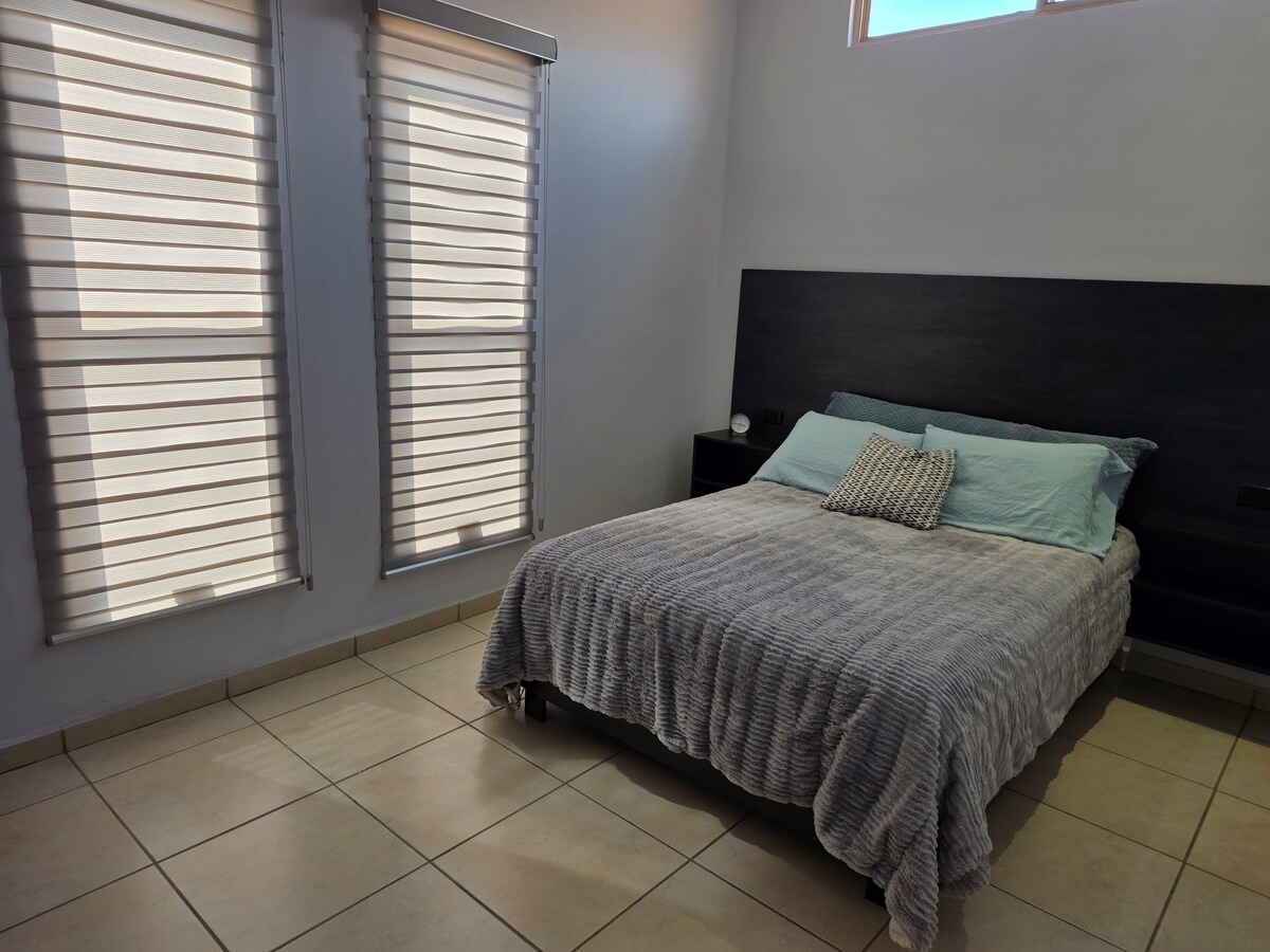 Este alojamiento único tiene mucho espacio para que disfrutes con los tuyos. Alberca privada, área de asador con TV, dos recamaras, 5 camas, 2 baños completos y dos medios baños, cochera con portón eléctrico, cocina totalmente equipada con todo lo necesario, las dos habitaciónes tienen minisplit, area de lavanderia techada con lavadora y secadora. el precio es por seis personas o menos despues de la sexta persona se cobra extra.