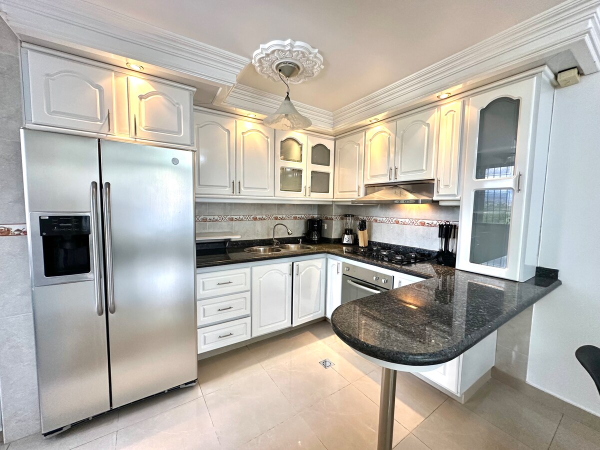 Disfruta de la comodidad de este refugio urbano con respaldo eléctrico y moderno diseño, a 5 min de todos los lugares de interés de S/C, cerca de todo, cocina full equipada con cafetera, arrocera, tostadora, sandwichera, microondas, utensilios de buena calidad, cuchillos profesionales , WiFi rápido, TV smart en cada área , A/C , nevera con hielo y agua calentador, lavadora- secadora , tanque de agua para emergencias, 1 puesto de estacionamiento techado entrada autónoma con caja de llaves 24/7