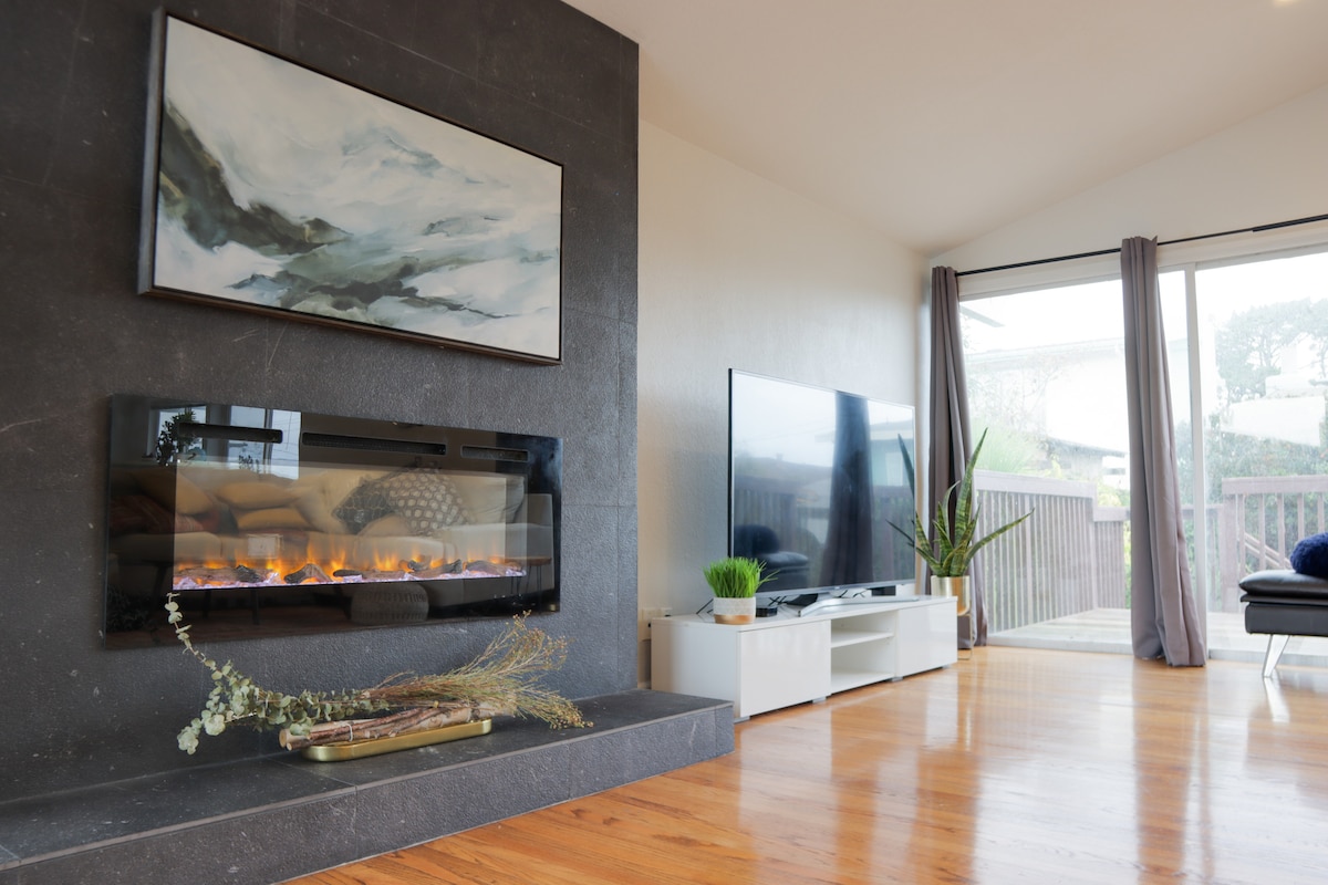 Tận hưởng sự sang trọng tại ngôi nhà 4 phòng ngủ nhìn ra biển của chúng tôi, chỉ cách SF vài phút. Thức dậy với khung cảnh mê hoặc trong mỗi phòng và tìm thấy sự thư giãn trong không gian mở được trang trí bằng trần nhà hình vòm và lò sưởi gas. Đối với công việc hoặc giải trí, được hưởng lợi từ bàn làm việc và WiFi nhanh trong mỗi phòng ngủ. Tiếp tục hoạt động với xe đạp Peloton của chúng tôi hoặc thư giãn ngoài trời với bồn tắm nước nóng Suối nước nóng, hố đốt khí đốt tự nhiên và sân cỏ nhân tạo 30'x20'. Lưu ý: Không tổ chức tiệc tùng, tối đa 8 khách, 3 xe. Số giấy phép STR: 14614799