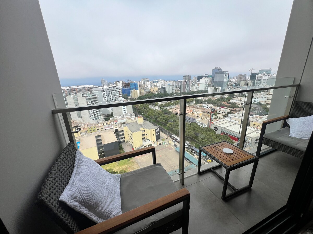 Chào mừng bạn đến nhà của bạn xa nhà! Trong căn hộ một phòng ngủ tối giản này, bạn sẽ tìm thấy tầm nhìn thoáng khí ra trung tâm tài chính của Lima từ cả ban công và phòng ngủ . Với nhà bếp đầy đủ tiện nghi, bộ tổ hợp máy giặt - máy sấy, TV 55" QLED, Wi-Fi, hồ bơi, bể sục và các dịch vụ trợ giúp đặc biệt. Căn hộ hoàn toàn mới này nằm thuận tiện trong cộng đồng quốc tế San Isidro, chỉ cách Trung tâm tài chính 7 phút đi bộ và cách Miraflores và Parque el Olivar 10 phút đi bộ.