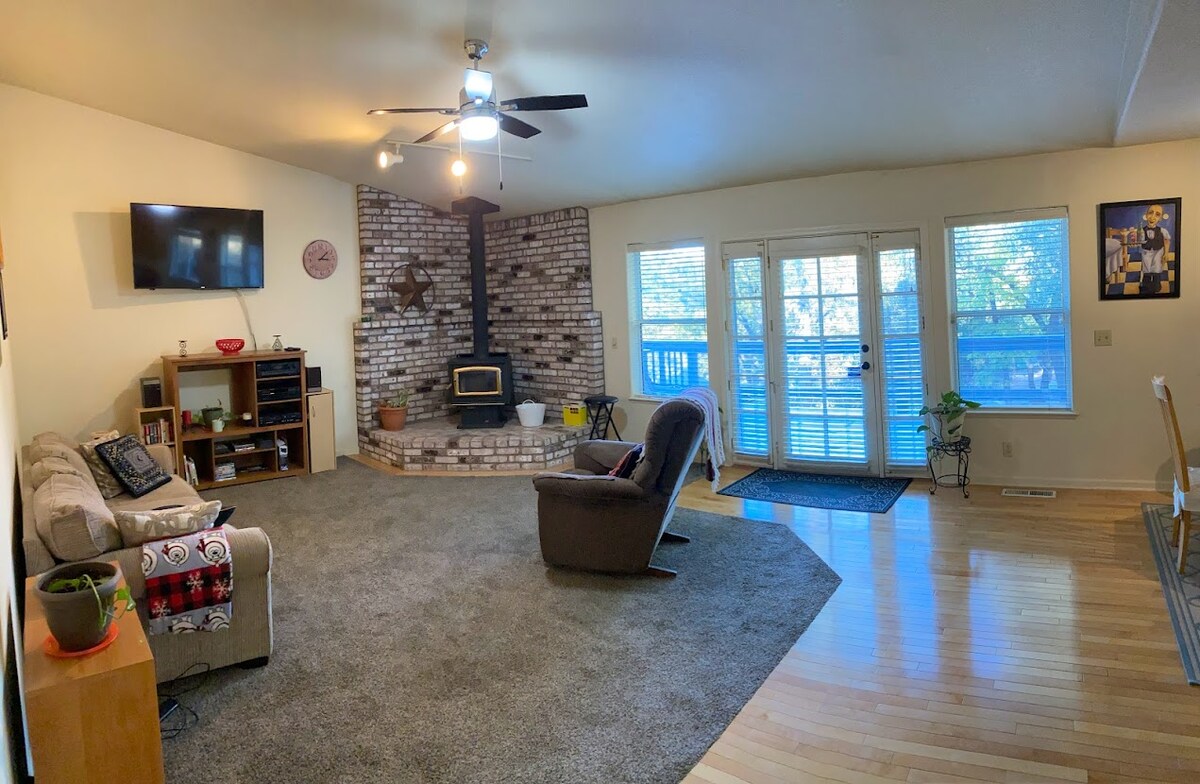 Mới tu sửa 2 pho ̀ ng ngu ̉, 2 pho ̀ ng ngu ̉. #1BR có giường cỡ king, bàn làm việc, Amazon Fire TV và phòng tắm khép kín có bàn trang điểm kép ngăn cách với nhà vệ sinh và bồn tắm/ vòi sen. #2BR có giường tầng đầy đủ và giường đôi, và trò chơi Arcade 4 người 1 người. #2BA có thể truy cập từ #2BR và khu vực ăn uống. Bếp đầy đủ có bếp gas/ lò nướng. Phòng khách có ghế sofa cong và Amazon Fire TV. Quạt trần trong mỗi phòng, hệ thống sưởi và không khí trung tâm. Đỗ xe tại chỗ ở hoặc ngõ cụt. Lò sưởi propane, ăn uống ngoài trời. Không hút thuốc. Không mang theo thú cưng.