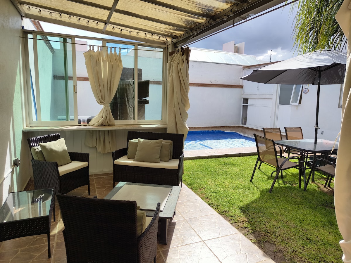 Ngôi nhà ấm cúng, cách trung tâm Tequisquiapan 10 phút đi bộ, 3 phòng ngủ, 2 phòng tắm đầy đủ, vườn lớn, pergola, hồ bơi và lò nướng. Ở với phòng khách, phòng ăn và lò sưởi. 600 mét vườn.
