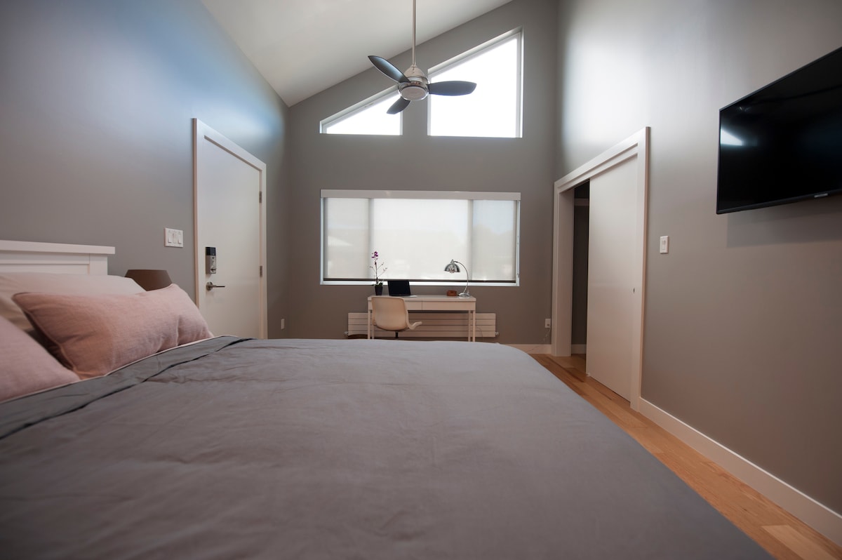 Our spacious guest suite has its own private entrance, comfortable pillow-top king size bed, work-friendly laptop desk, hi-speed wifi, spa bathroom with heated floor, mini fridge, and microwave. The guest suite is part of the main home, but there are no shared spaces and the areas are separated by a locked solid wood door & noise-dampening cushions. Our guest suite is ideal for couples visiting family in the neighborhood.