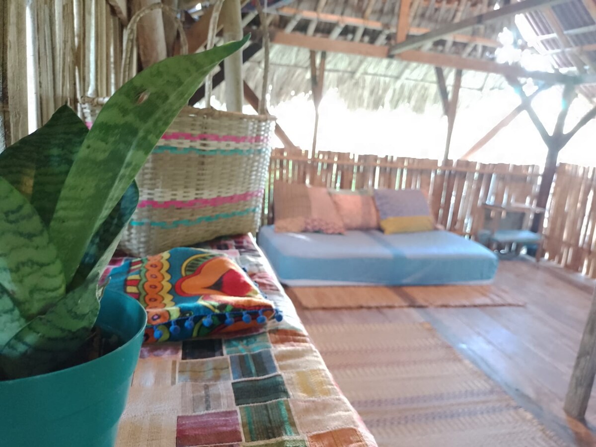 Cabaña rodeada de árboles grandes, al lado de un campo donde pastan vacas y burros, al frente de una reserva de manglares y ha cinco cuadras del mar. Ideal para sanarnos de las dolencias mundanas, de la contaminación y recuperar nuestra esencia salvaje. Las habitaciones:Van Gogh, Frida, Macondo, Titanic, Caracola marina y Mangle, un hamacario para tumbarse y no hacer nada, una viejoteca que es un homenaje a los juglares del Mar y un baño de luna para jugar con la desnudez y la noche.
