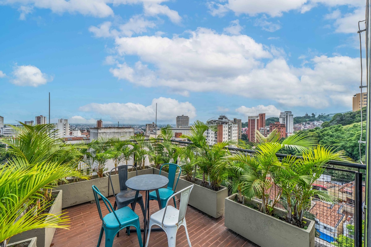 El apartamento está ubicado en San Antonio, una zona tradicional, turística de Cali, muy central. A solo 5 minutos caminando de restaurantes, cafés, sitios para bailar salsa, Academias, supermercados y sitios de interés turistico Es una buena opción para quienes vienen por varios días, trabajan remoto o visitan familia y buscan un lugar cómodo. Ademas disfrutar de la terraza del edificio podrás : ver atardeceres, guacamayas y disfrutar la brisa caleña, ademas de una vista hermosa.