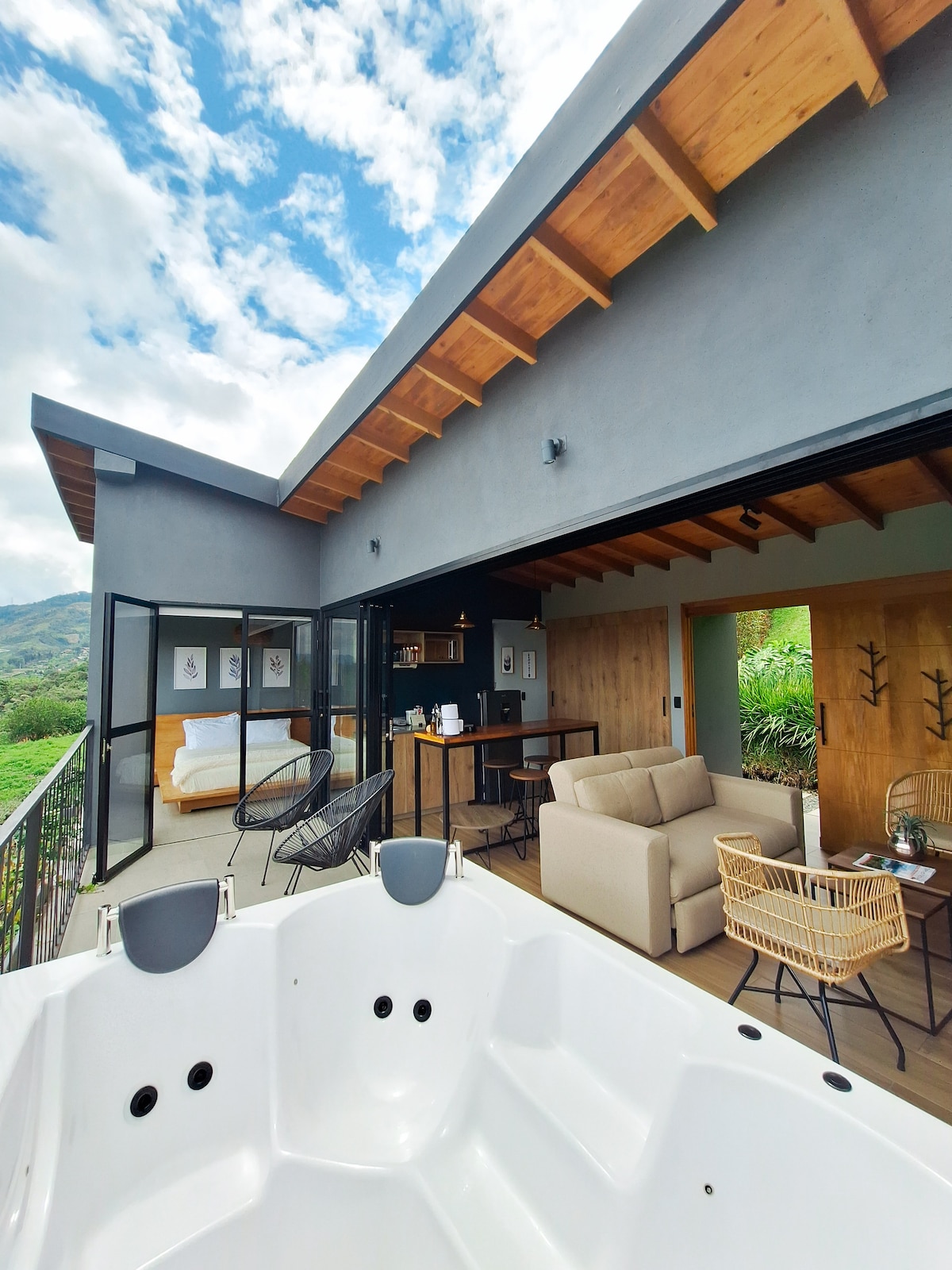 FORESTA is a modern cabin created with love for you to have an unforgettable stay in the middle of nature, with total comfort. Enjoy the privileged views from the deck, chill out in the jacuzzi, watch the dozens of birds that visit us, or have a chat by the fireplace in the living room. FORESTA is a great launchpad to explore Guatape, climb the Rock and do kayaking, jet-skiing, wakeboarding, sailing, paraglading, horseback riding, hiking, helicopter tours or ATV rides. You choose!