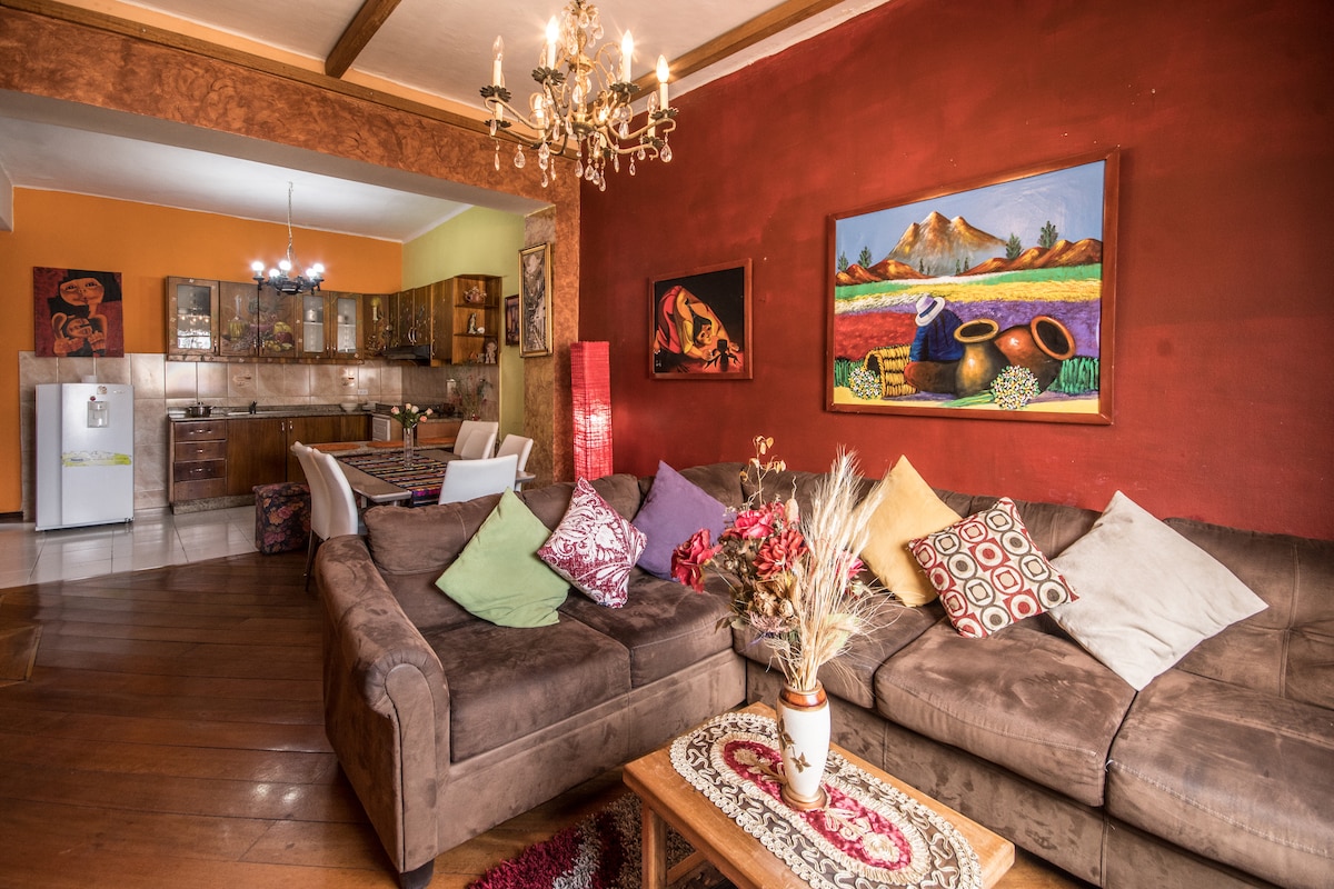 Căn hộ ấm cúng được tu sửa ở khu thuộc địa Quito, nằm ở tầng ba, một tầng lửng với tầm nhìn toàn cảnh ngoạn mục ra Trung tâm Lịch sử. Nó có hai phòng ngủ, hai phòng tắm, một phòng khách, một phòng ăn và một nhà bếp được trang bị nước lọc và các dụng cụ thiết yếu để đáp ứng nhu cầu của khách. Các tiện nghi thoải mái mang lại sự thư giãn tốt. Chúng tôi có Wifi 620Mbps và 1,05Gbps, đường dây điện thoại, TV với Netflix và máy sưởi cho vòi sen và bồn rửa nhà bếp.
