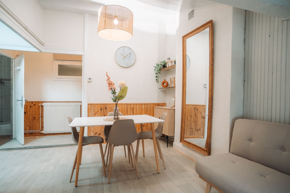 ✨Studio calme et chaleureux, spécialement pensé pour le repos et le bien être.🧘♀️ Après une journée active, retrouvez un intérieur apaisant et idéal pour vraiment récupérer. Sans TV, l’atmosphère est sereine, propice à la détente. 😴 Lit confortable avec oreillers à mémoire de forme, linge de lit inclus et lit fait à l’arrivée. Produits de base fournis. Cuisine équipée pour le quotidien. Tout est inclus ! Parking à proximité. Arrivée autonome, boîte à clés. 🔑