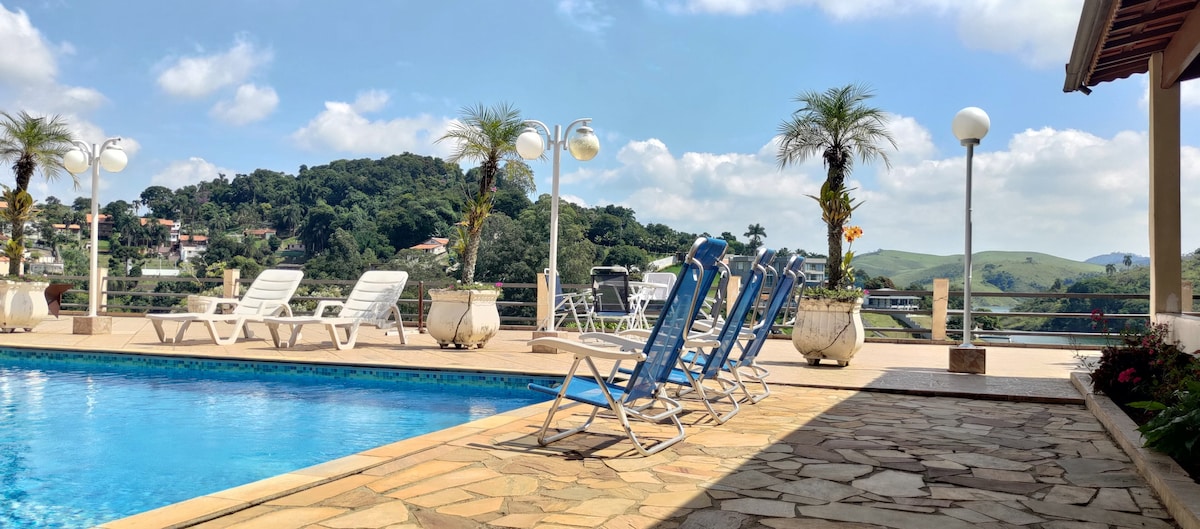 Hoàn hảo để thư giãn với gia đình, bạn bè 🏡 Sức chứa tối đa 15 khách 🛁 3 phòng tắm và 1 phòng tắm 🚗 6 chỗ đỗ xe Hồ bơi 🏊♀️ lớn (sâu 5x13m và 1,60m) Phòng 🧖♀️xông hơi khô 📶 Wi-Fi và Netflix Bếp được trang bị, có 2 bộ lọc nước. 🥩BBQ Khăn trải giường (chất lượng cao cấp) Máy thở trong phòng ngủ và phòng khách. 🐟Hồ câu cá thể thao Vườn với cây ăn quả (pitanga, acerola, v.v.) Môi trường lý tưởng để nghỉ ngơi và kết nối với thiên nhiên.