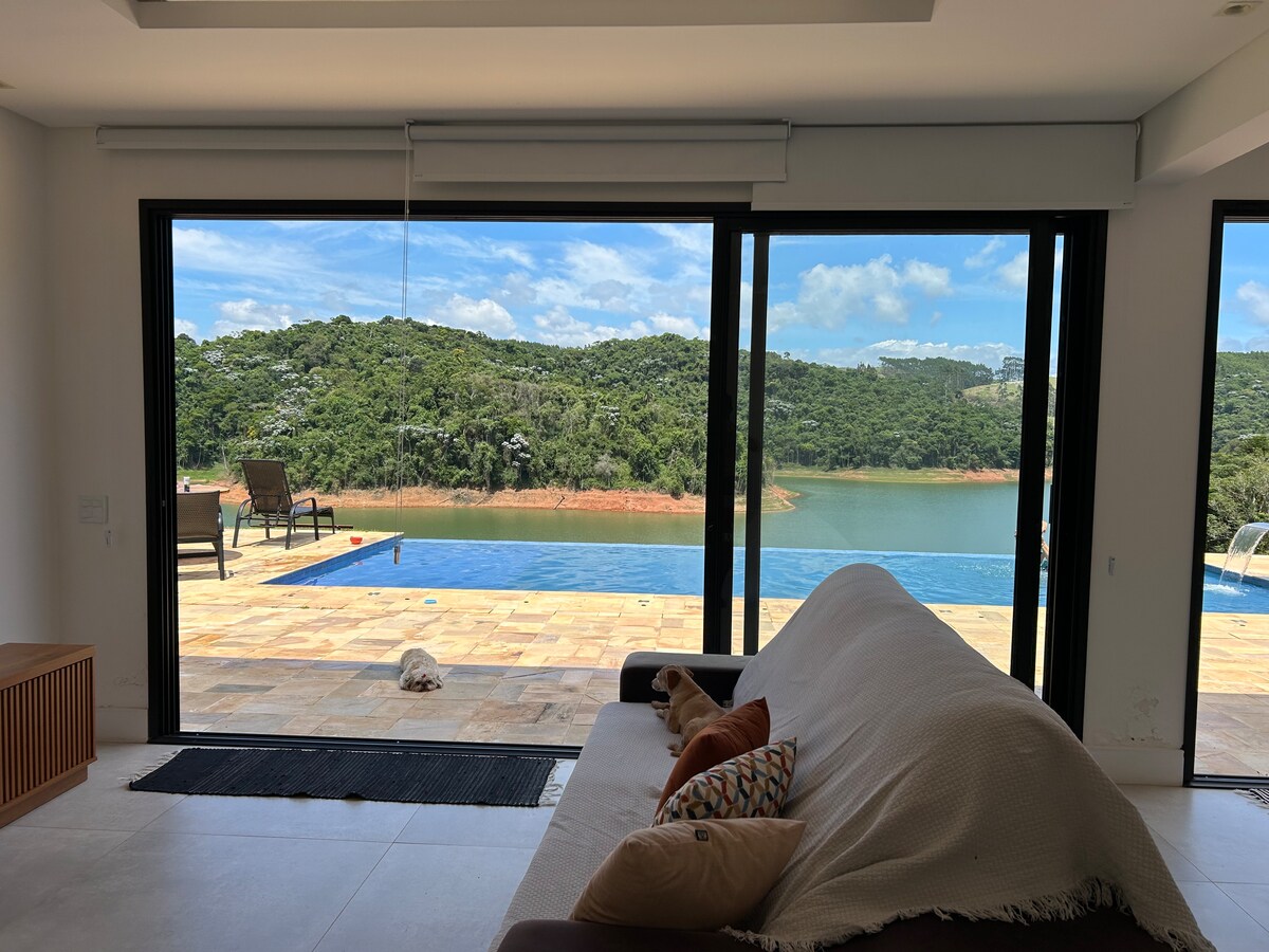 Vista espetacular para a represa, tranquilidade, segurança, lugar único com todo conforto. Ideal para relaxar e aproveitar momentos inesquecíveis com amigos e familiares em Igaratá a 1h de SP. Casa com 2 dormitórios para 8 pessoas, piscina borda infinita climatizada*, acesso privativo a represa com pier, churrasqueira, sala, sala de jantar, cozinha integrada, 3 WC, Wi-Fi 1 GB. Traga o seu jet-ski e desfrute da emoção de navegar pela represa rodeado por paisagens e a tranquilidade da natureza